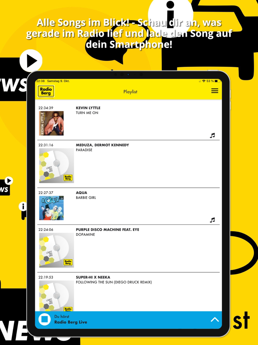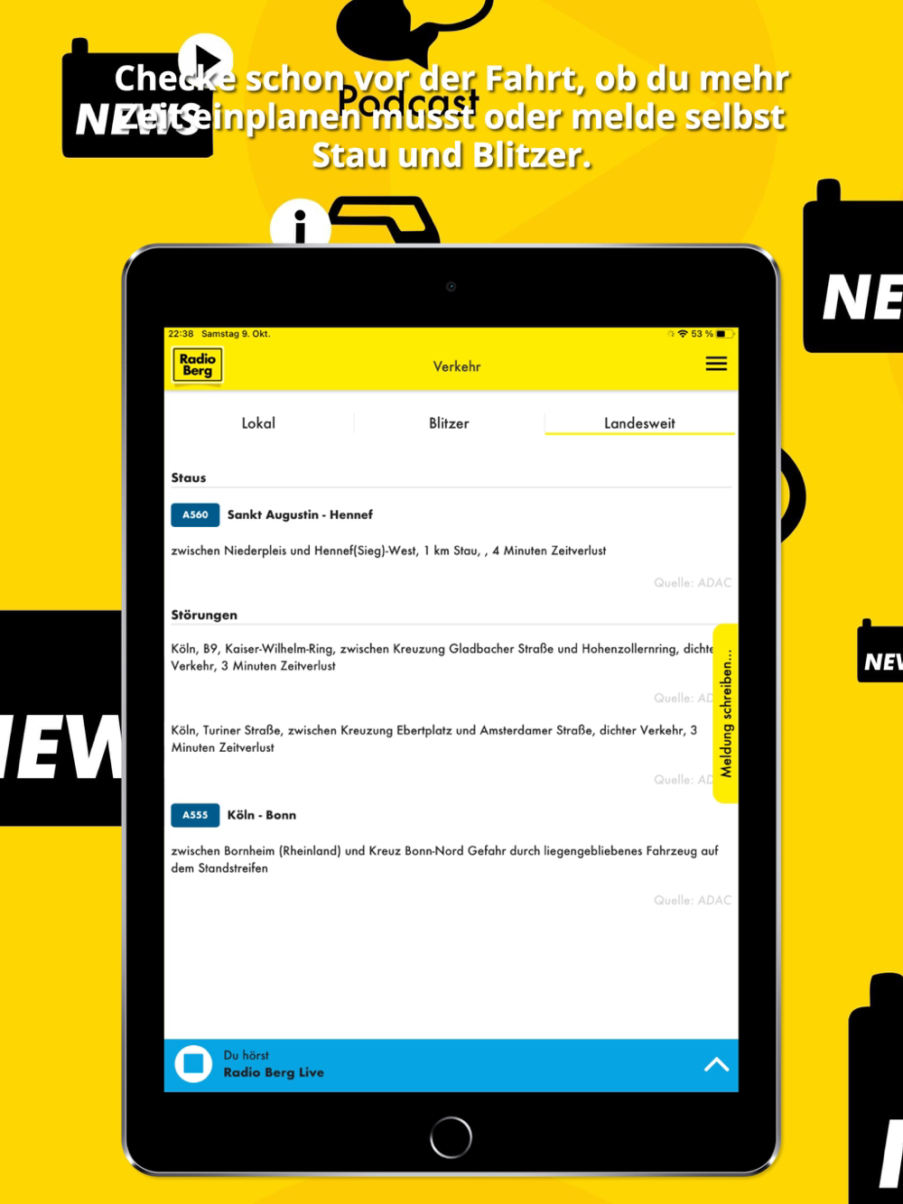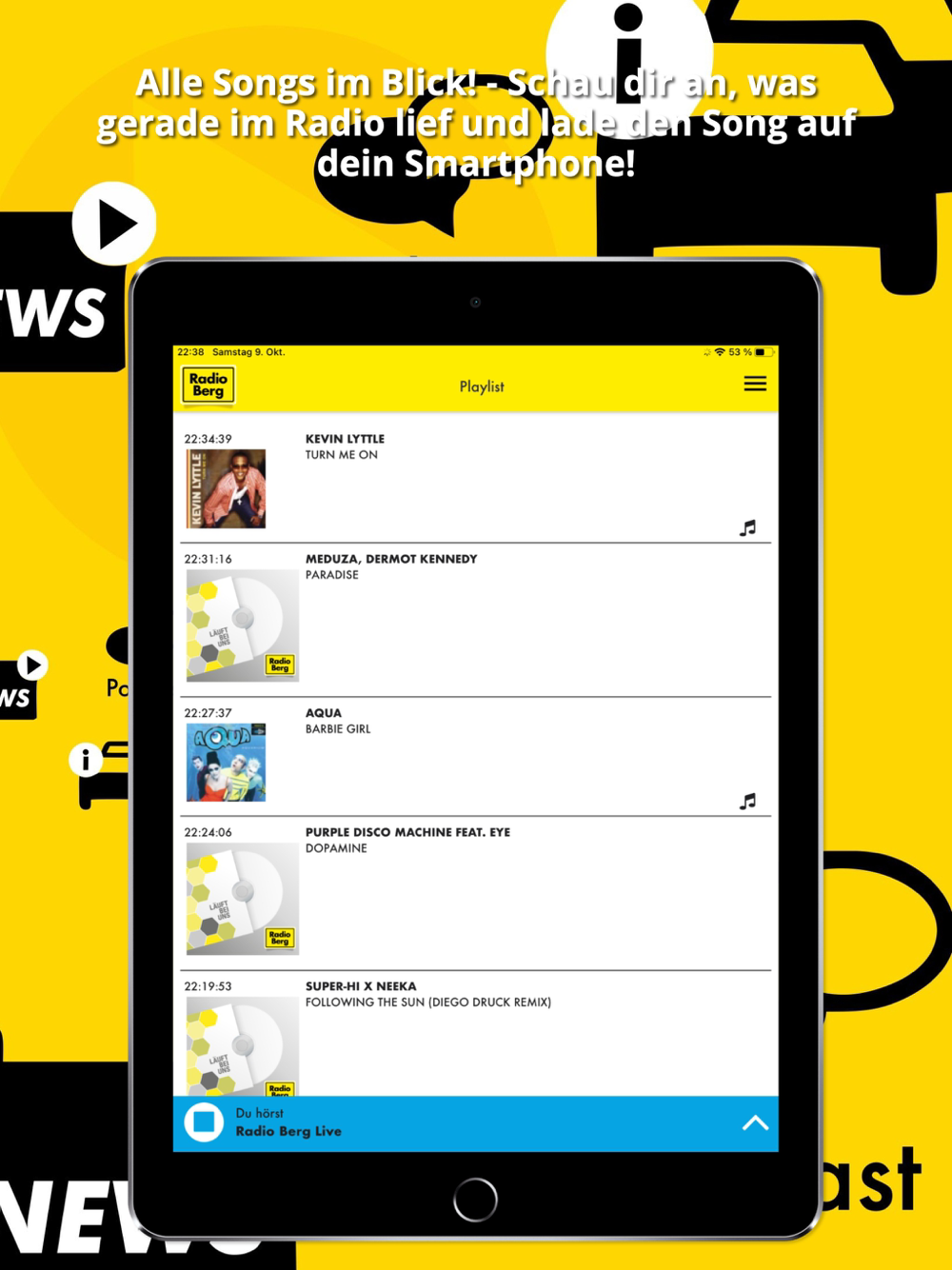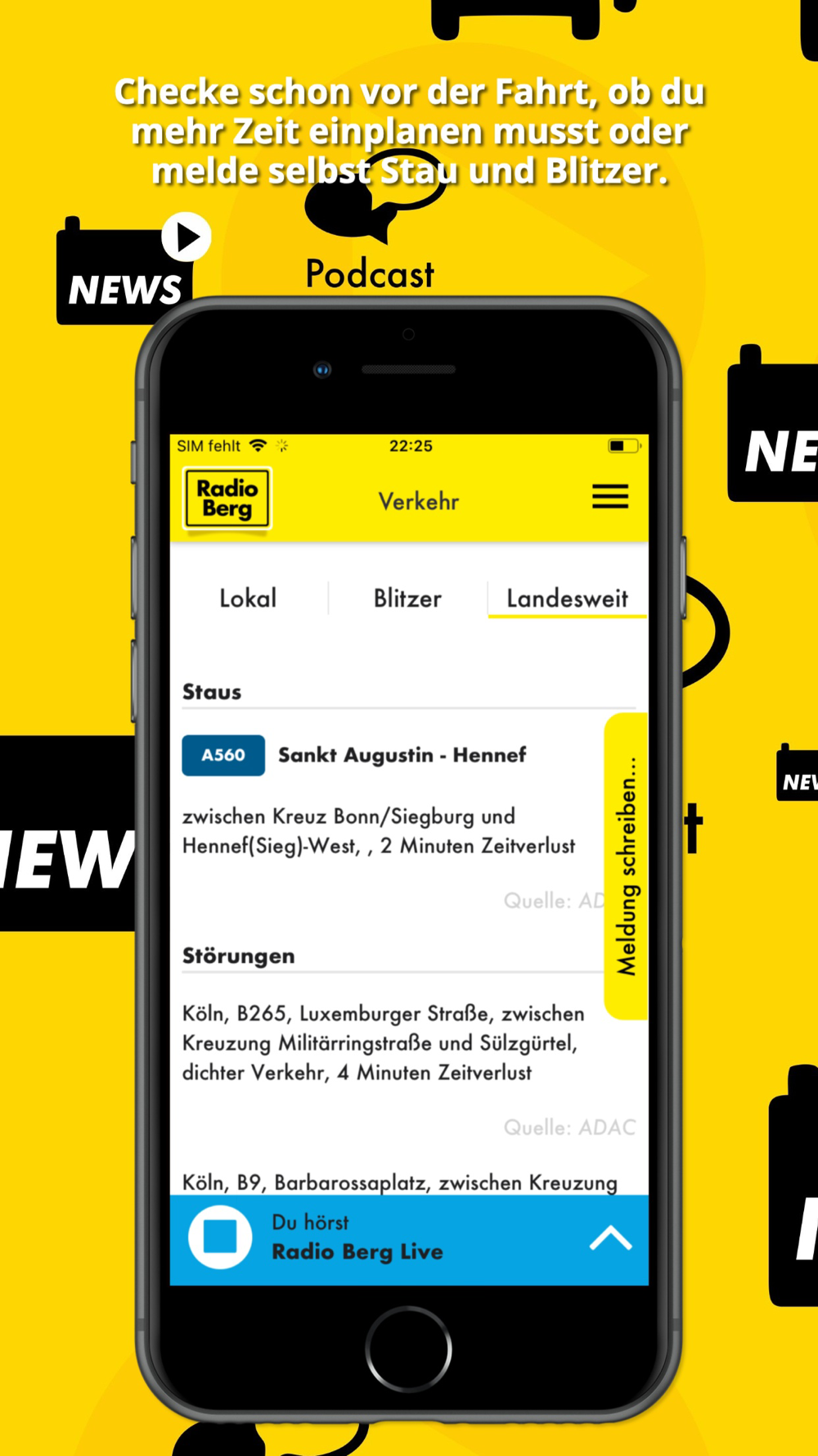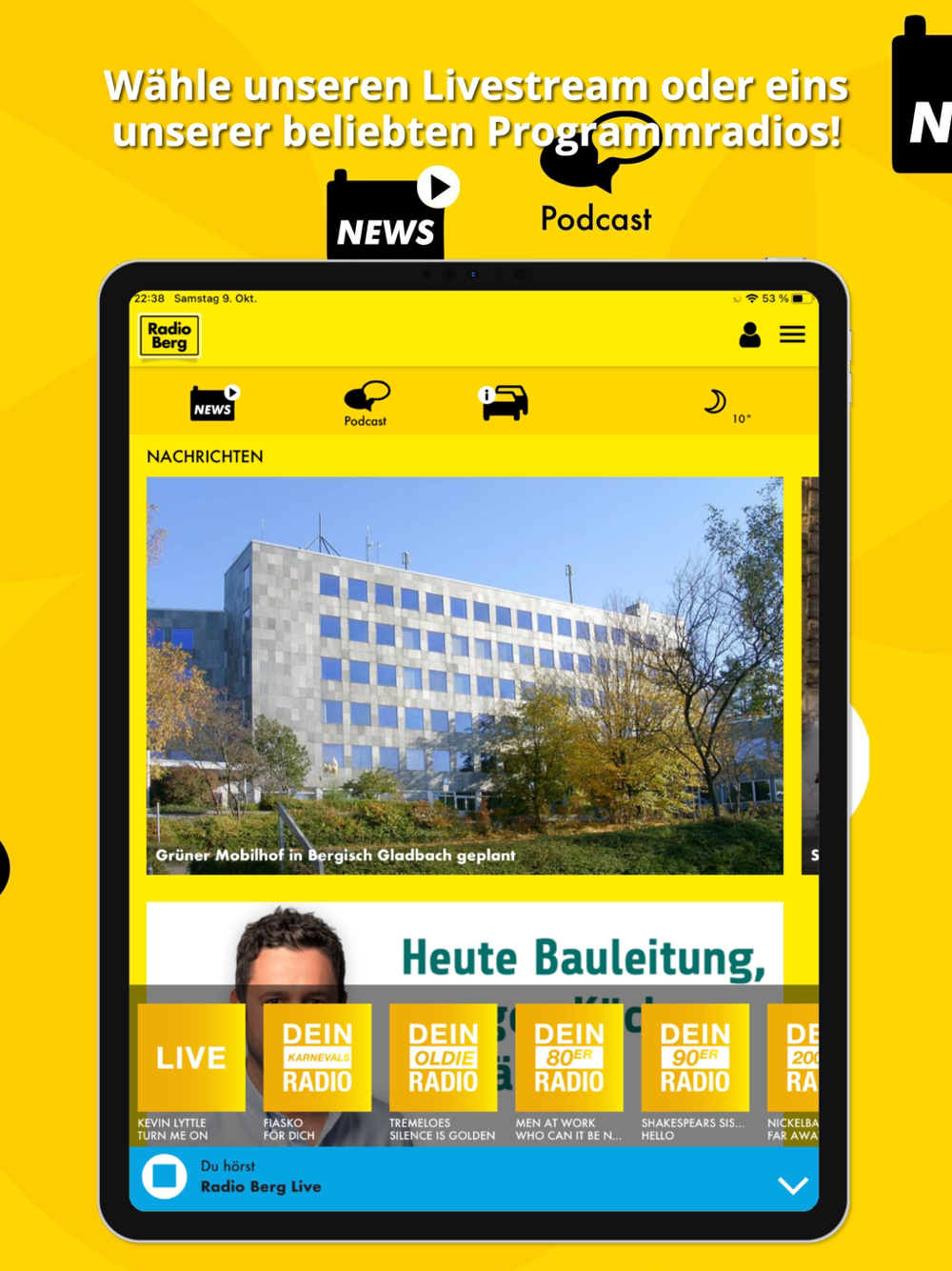 Mit unserer App bleibt ihr immer auf dem neuesten Stand. Wir bringen alle Infos aus dem Bergischen auf euer Smartphone. Aktuelle Nachrichten, Infos zum Programm, Events und Aktionen. Hört das Programm über unseren Livestream oder wählt einen unserer Channel aus. Außerdem bekommt ihr die wichtigsten Infos direkt als Push-Mitteilung auf eurem iPhone oder auf der Apple Watch.
