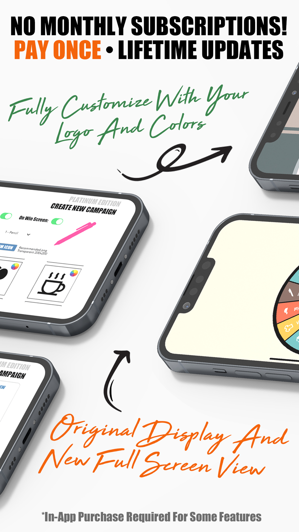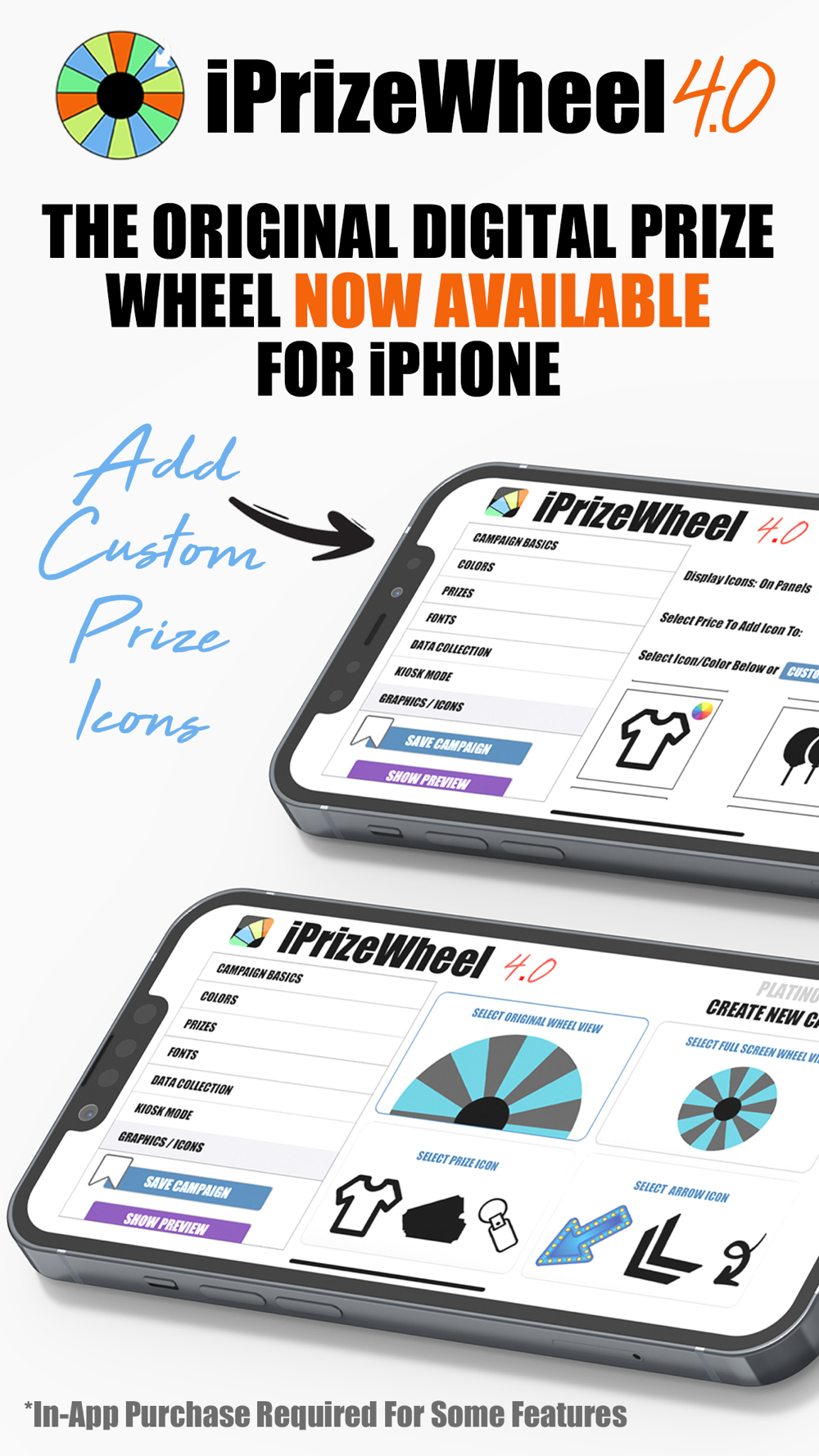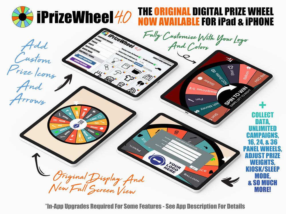 Now available for iPhone and iPad! Seen At X-Games, Sport Stadiums, Casinos, Concerts, Tradeshows & More! Over 15,000 Downloads - A Top 50 Productivity App PadGadget.com - 4/5 Stars "Every so often I have the opportunity to evaluate an app that makes me say now that is a really cool use for the iPad! iPrizeWheel is one of those apps." AppAdvice.com - 4/5 Stars "iPrizeWheel HD is [an inexpensive] alternative to a physical prize wheel. It does what its advertised to do and it does it well." ipad-apps-review-online.com - 4/5 Stars "This is an app that you have to try [at your next] party. The games were already exciting and having to spin the wheel to get a prize was even better." iPadnGravy.com "If you or your organization are constructing a raffle or other promotion you should consider iPrizeWheel." --- The prize wheel & game wheel have finally been reinvented for the digital iPad and iPhone revolution! Introducing iPrizeWheel V4, the spin wheel app that turns your iPad and iPhone into a portable game wheel, customizable in just minutes! Why spend up to $1,500 on a heavy, bulky plastic wheel that's expensive to ship, time-consuming to customize, can break in an instant, and locks you into a single theme/brand? Now you can bring the prize wheel experience with you while you walk through a crowd, or let people come to you at your own location or booth. Use screen mirroring on an external HDTV or large-format monitor for an even bigger draw and watch the crowds form out of nowhere as people line up to interact with your brand and cheer on the winners! iPrizeWheel is completely realistic with sound effects and spin motion. It is ideal for any occasion where fun is required and excitement around your brand is a must: - Trade Shows - Concerts / Live Events - Education / Classrooms - Kiosks / Booths - Sports Bars / Restaurants - Youth Groups / Parties - Radio Stations - Retail - Dentist/Ortho Offices BASIC EDITION FEATURES... - Manage A Single 16 or 24 Panel Campaign - Set Up To 2 Different Panel Colors - Change Panel Text Color - Change Middle Circle Color - Change Spin Arrow Color - Set Panel Prizes With Greater Customization Options UPGRADE TO PREMIUM EDITION Our Premium Edition is packed with even more customization options and data collection tools to make your events a huge success... - Add / Manage Unlimited Campaigns - 1-Click Campaign Copying - Custom "CONGRATS" Screen Text - Set Up To 4 Different Panel Colors - Add Your Own Logo - Access 32 Panel Wheel - Turn On Powerful Data Collection Tools (Collect Contact Info & Store Prize Giveaway Details) - Customize Your Data Entry Screen w/ 14 field options. - Kiosk Mode (in-app screensaver) - Export/Import Campaign Settings For Multiple iPads - Customize Fonts and Font Sizes On Panels - Toggle Spin Time Between 7 and 3 Seconds - Toggle Spin Click Sound On/Off - Edit the Congrats Sound At the End Of the Wheel Spin (Play Any Sound/Song Loaded On iPad) - More Color Customization - Change the Spin Arrow, Background, Wheel Borders, and Prize Arrow - More Congrats Screen Customization - Change Text Color, Background Color, and Opacity UPGRADE TO GOLD EDITION - Add Custom Data Fields and Checkboxes to Data Collection Panel - Add images and icons to your panels, prizes, and congrats screen! (Platinum Edition) - Change the arrow icon to any shape or image! (Platinum Edition) - Select the new full-screen wheel view! (Platinum Edition) - Change the color of the arrow or prize icons! (Platinum Edition)Control Panel/Prize Weight and Probability UPGRADE TO THE NEW V4 PLATINUM EDITION - Add images and icons to your panels, prizes, and congrats screen! (Platinum Edition) - Change the arrow icon to any shape or image! (Platinum Edition) - Select the new full-screen wheel view! (Platinum Edition) - Change the color of the arrow or prize icons! (Platinum Edition) See iPrizeWheel in action now at http://www.iPrizeWheel.com. And please email us with comments at