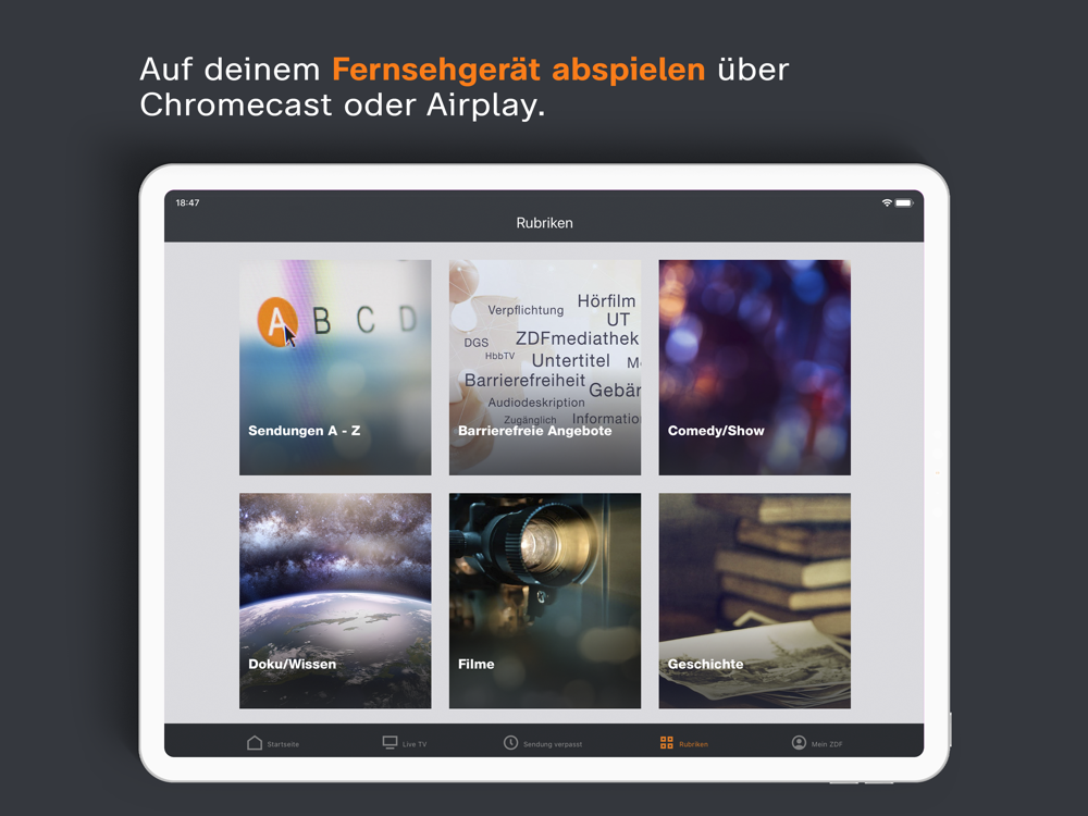 Du hast die heute-show am Freitagabend verpasst oder besitzt gar kein Fernsehgerät? Dank der ZDFmediathek kannst du dennoch auf das komplette Angebot des Zweiten Deutschen Fernsehens zugreifen – und das bequem per iOS-App. Ob du nun bereits ausgestrahlte TV-Serien und Filme zu einem späteren Zeitpunkt ansehen willst oder das Spiel deines Lieblingsvereins live auf dem Tablet verfolgen möchtest: Die Mediathek macht es möglich und überträgt das gewünschte Programm schnell und ohne Ruckeln auf dein mobiles Endgerät.