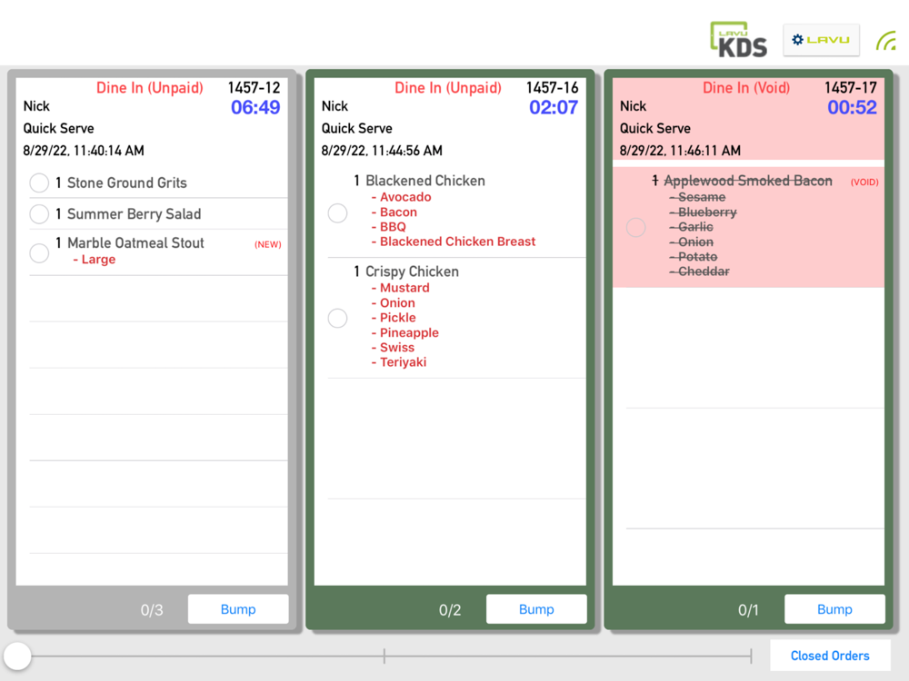 Lavu KDS 2.0's stylish touch-screen display makes your process simple and fast. The Lavu KDS can be extended to display on full-screen monitors should that fulfill your needs.