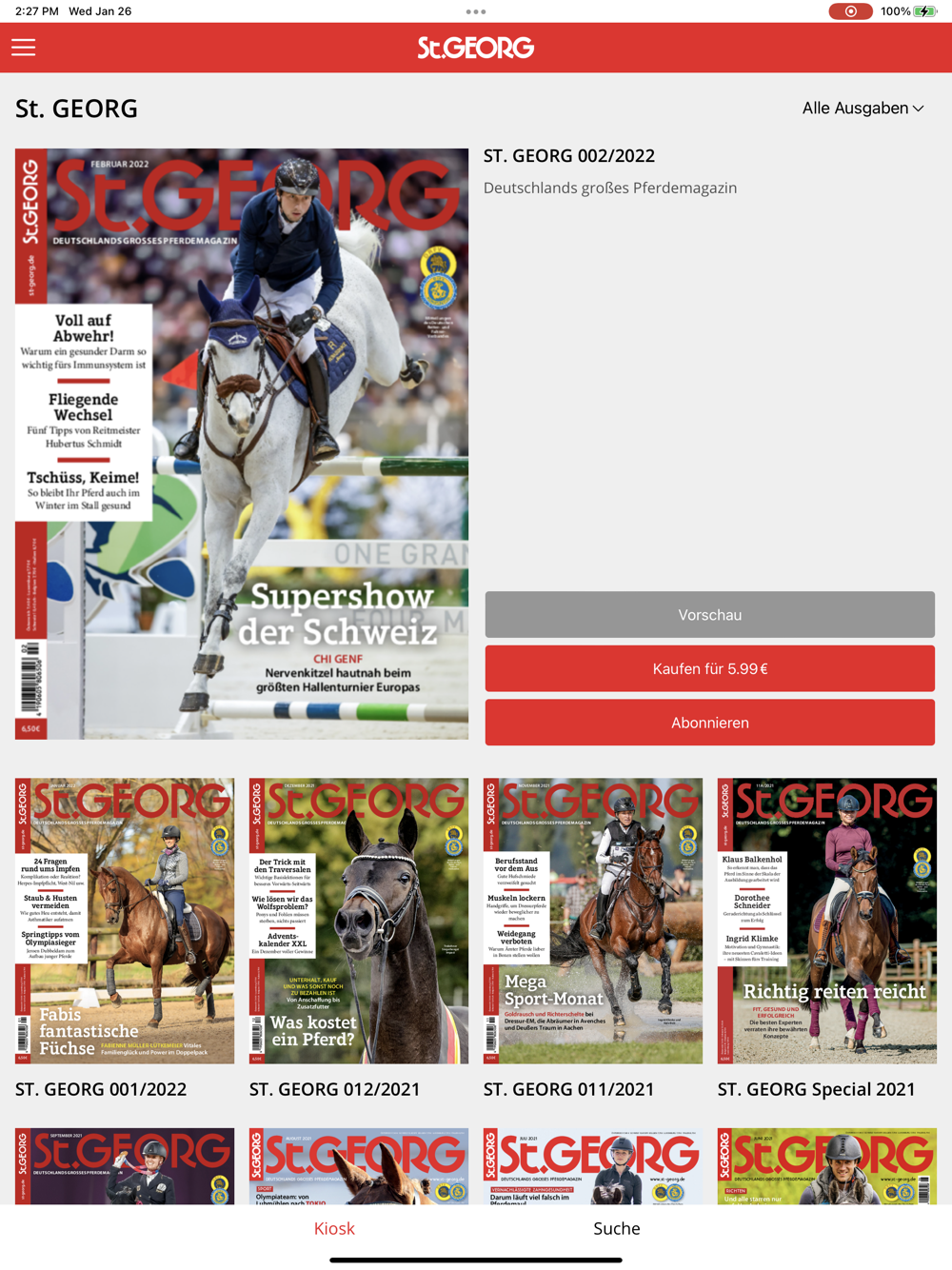 St.GEORG ist das traditionsreichste Reitsportmagazin und gleichzeitig einer der führenden Titel Deutschlands. Die aktuelle und kompetente Berichterstattung über sämtliche Facetten des Reitsports sowie die attraktive Optik machen St.GEORG zum unentbehrlichen Reitsportmagazin. St.GEORG bietet Monat für Monat umfangreiche Tipps rund ums Reiten, lässt Experten zu Wort kommen und garantiert mit spannenden Reportagen Unterhaltung pur! Für Reiter, Züchter und alle, die Spaß an Pferden haben.