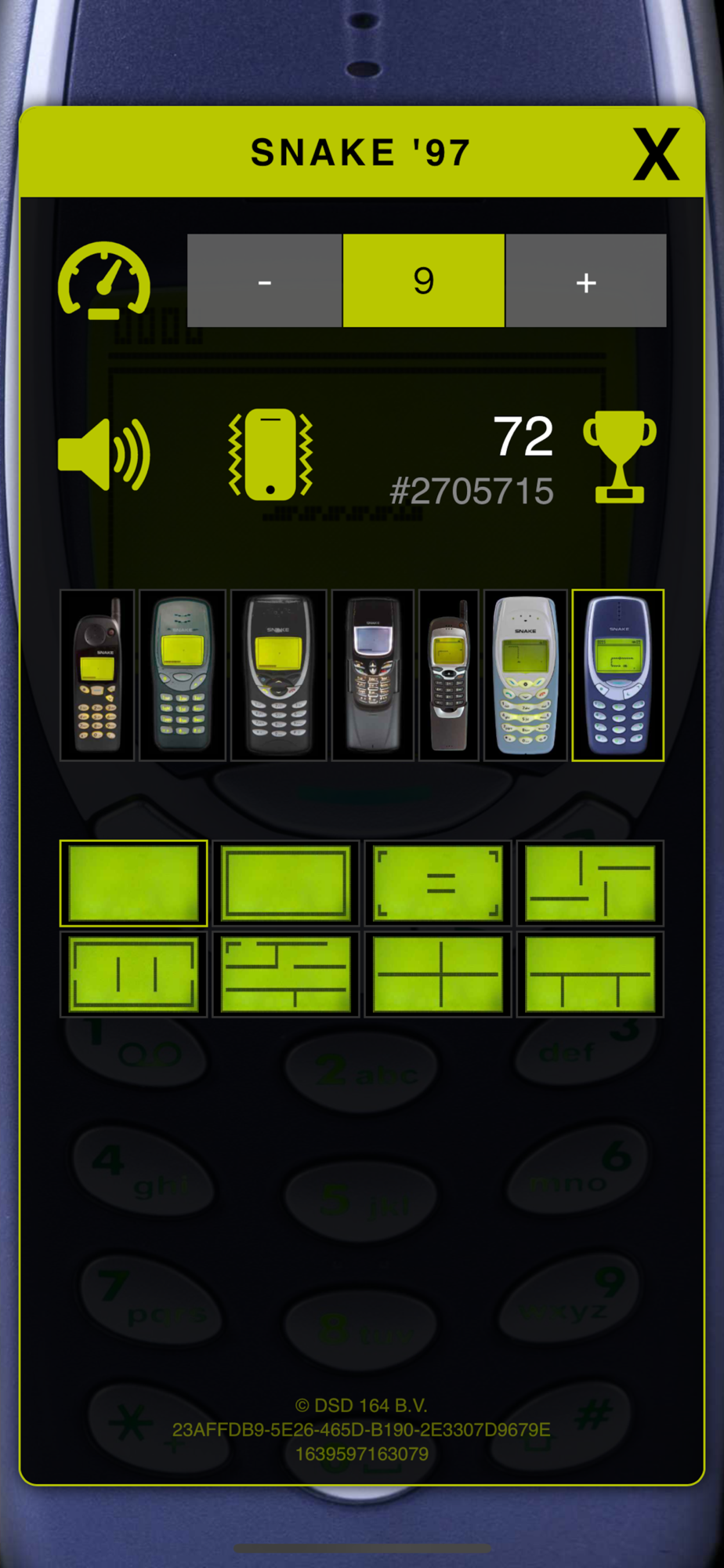 - 7 classic game modes (5110, 3210, 8210, 8850 and 3310, 3410, 7110 with Snake 2)