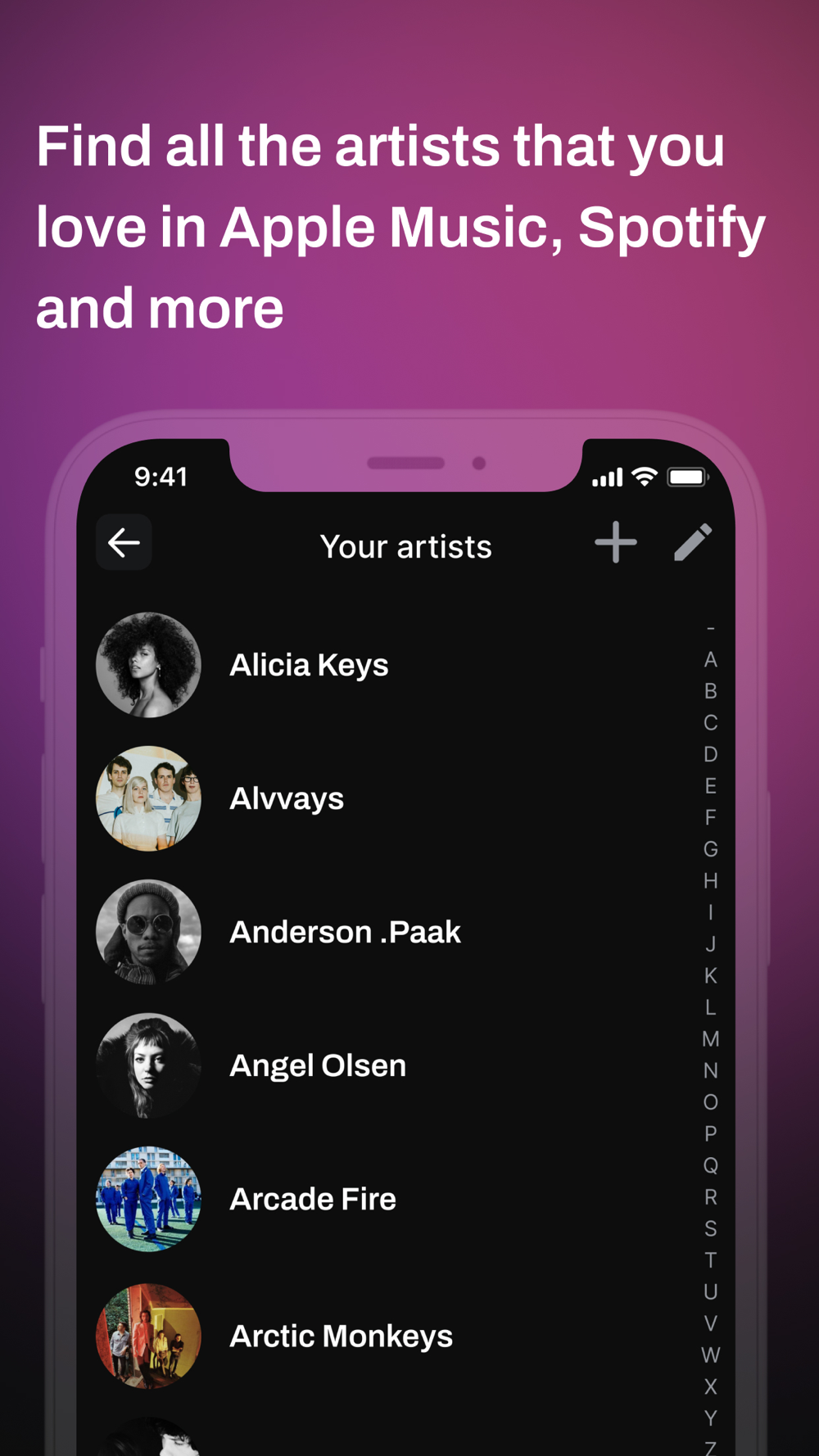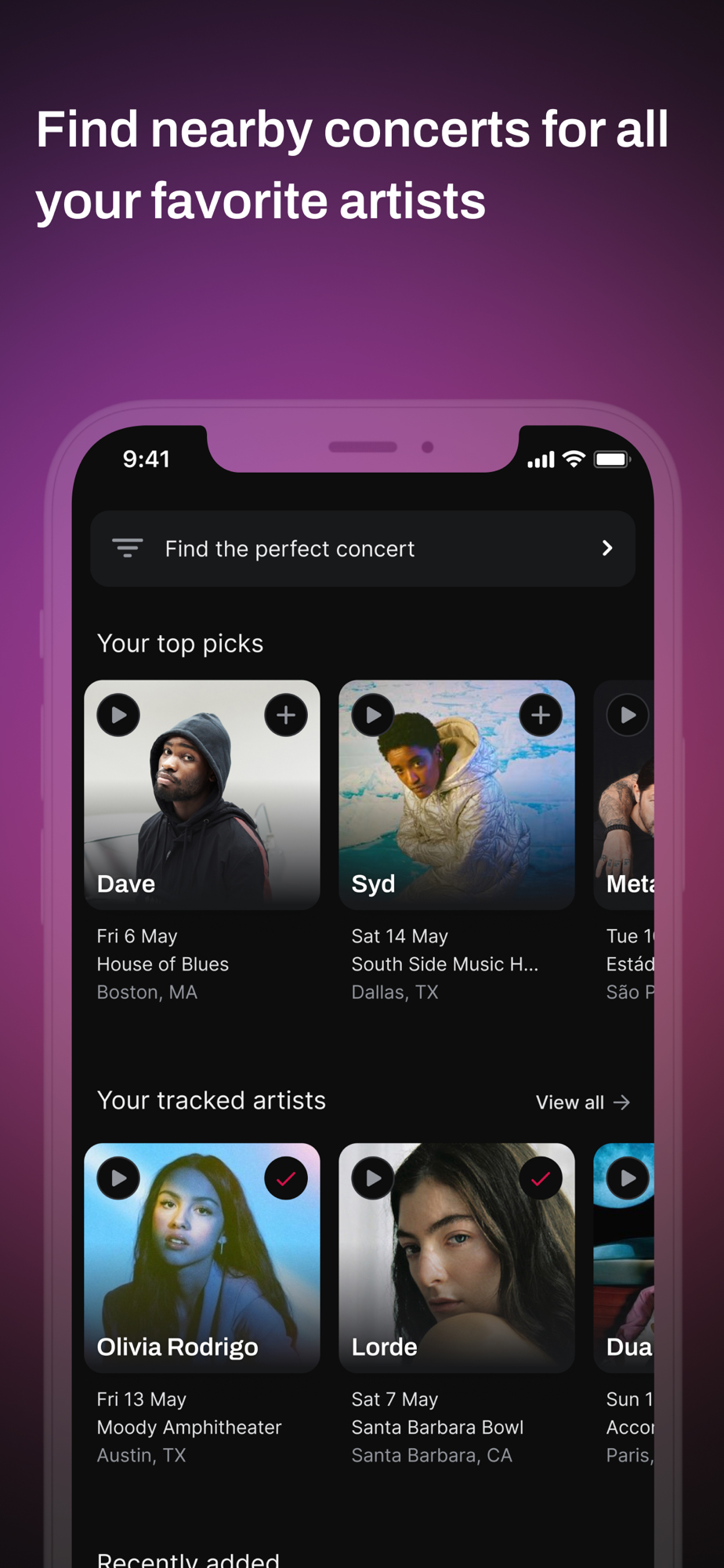 • Instantly track your favorite artists with imports from your music library, Apple Music, Spotify and Facebook.