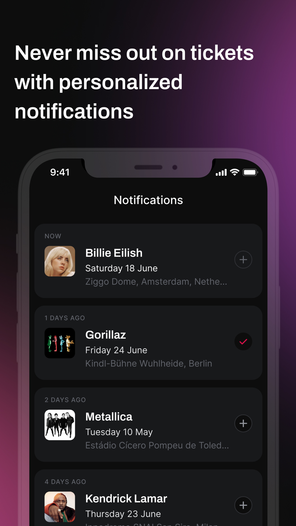 Songkick makes it so easy to go to concerts. Track your favorite artists and we’ll notify you as soon as they announce tour dates nearby, with everything you need to buy tickets. You’ll never miss another show!