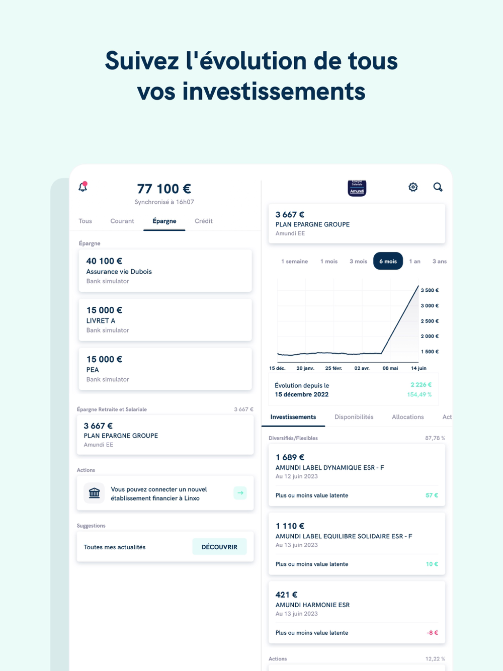 Au-delà de la vue d’ensemble sur vos comptes classiques, Linxo vous offre un suivi simplifié de tous vos comptes d’épargne (PEA, PEE, PER, Assurance vie, etc ...) quelque soit votre établissement financier. Vous pouvez également visualiser la répartition de vos fonds d’investissement ainsi que suivre leur performance dans le temps.
