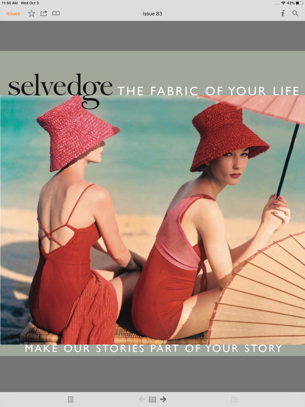 For crafters, couturiers or connoisseurs... Selvedge magazine is for everyone who loves textiles. Inspiring and informative, Selvedge is the only magazine to cover every facet of textiles – interiors, fashion, fine art, travel and shopping – in an intelligent, stylish and contemporary way. We cover textiles made with time, thought and skill in a magazine produced in exactly the same way. Published every other month, each issue offers quality writing, the world’s best textile photography and original illustration.