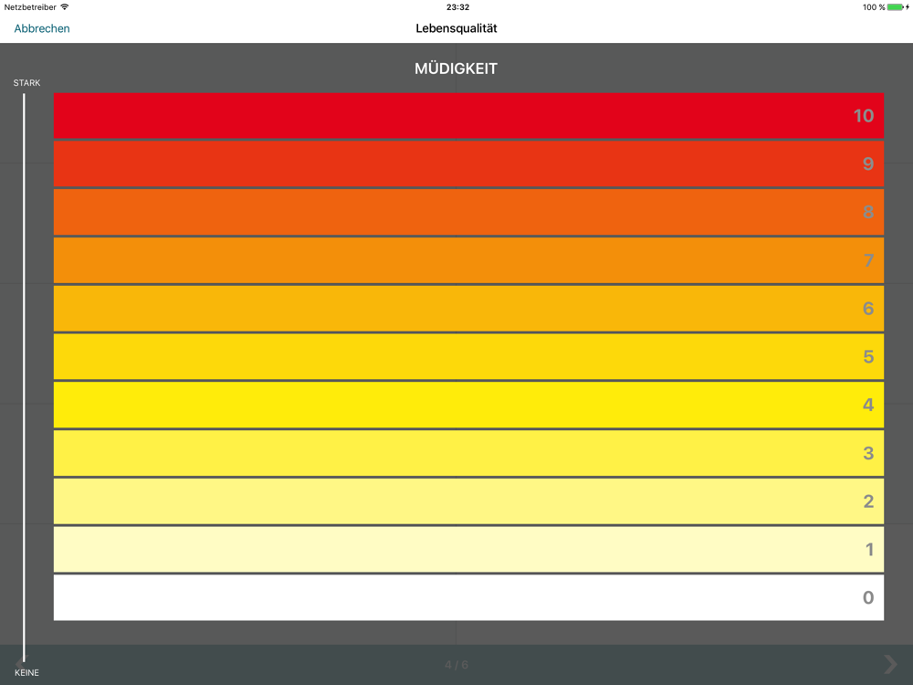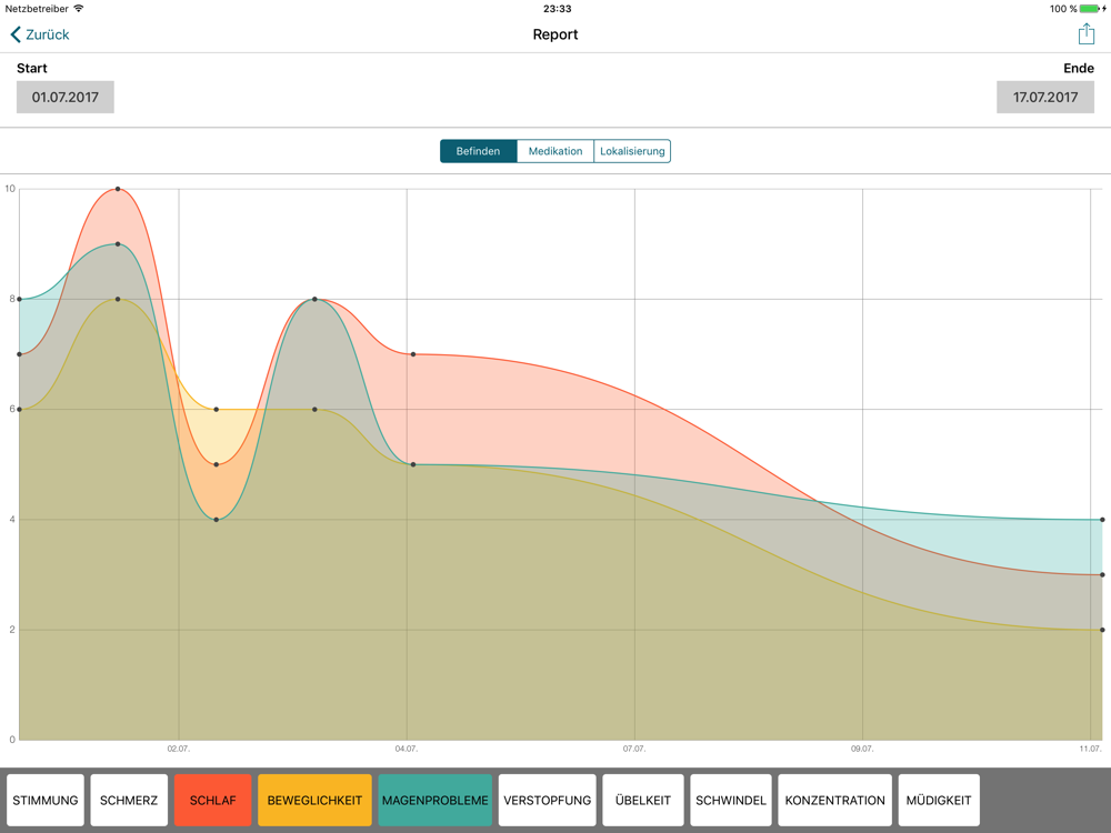 Für eine optimal auf Sie abgestimmte Therapie ist es daher hilfreich, Schmerzen und Beeinträchtigungen täglich aufzuzeichnen, um Ihre Schmerzen zu visualisieren. Mit dem PainTracer dokumentieren Sie alle wichtigen Parameter rund um Ihre Schmerzen, Ihr Befinden und Ihre Behandlung – einfach und unkompliziert. Mithilfe einer eindeutigen Skala geben Sie an, wie Sie sich fühlen, per Auswahlmenü speichern Sie Ihre Medikamente und die Dosis. Der Pain Tracer fasst Ihre Einträge zu aussagekräftigen Daten zusammen und macht Ihren Schmerz sowie Ihr Befinden für den Arzt in einem Report sichtbar. Dieser Einblick hilft dabei, Ihre Therapie optimal anzupassen.
