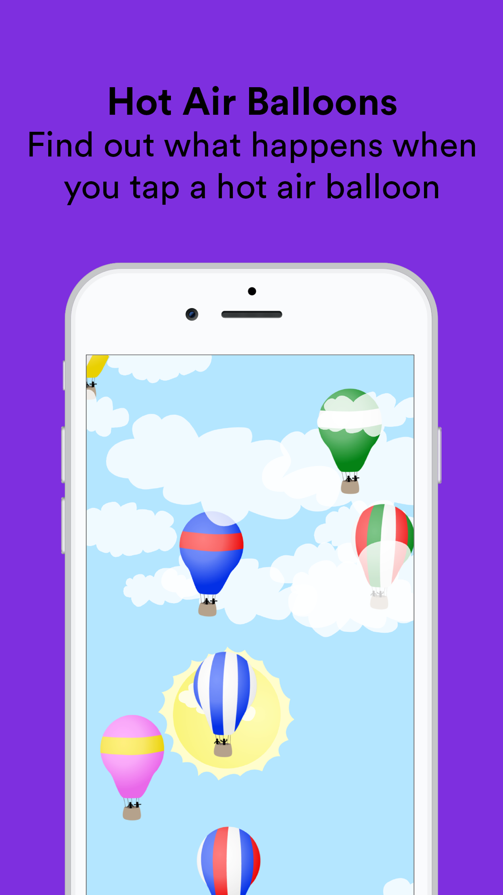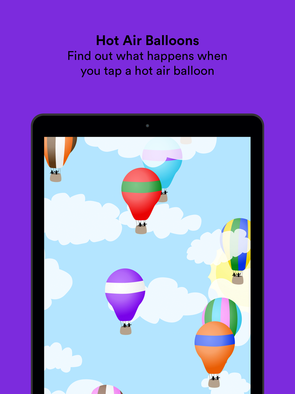 Hot Air Balloon: Hot air balloons float up the screen, and each time your baby touches one, and a skydiver jumps out with a parachute. When your baby shakes your device, skydivers will jump out of all the hot air balloons at once!