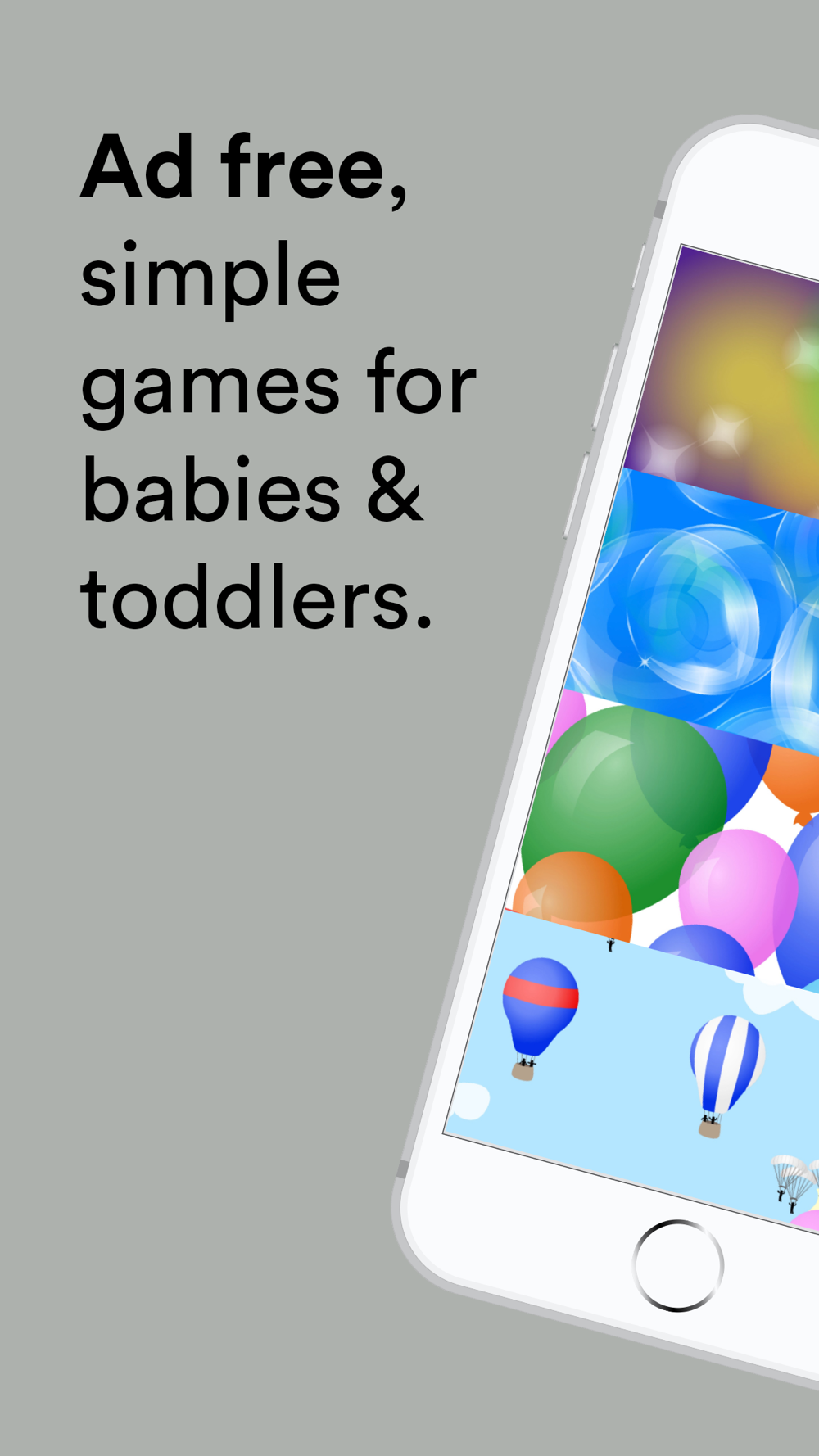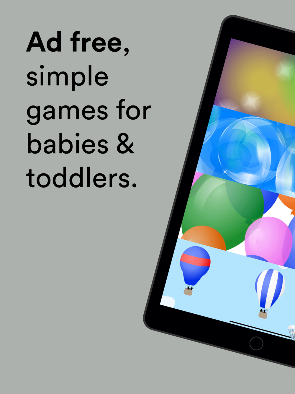 The Playmatic contains four simple, ad free games for babies: Magic, Bubbles, Balloons, and Hot Air. There are no ads during game play, no popups, and no settings. There's nothing that requires adult intervention, and there's nothing for your child to break.