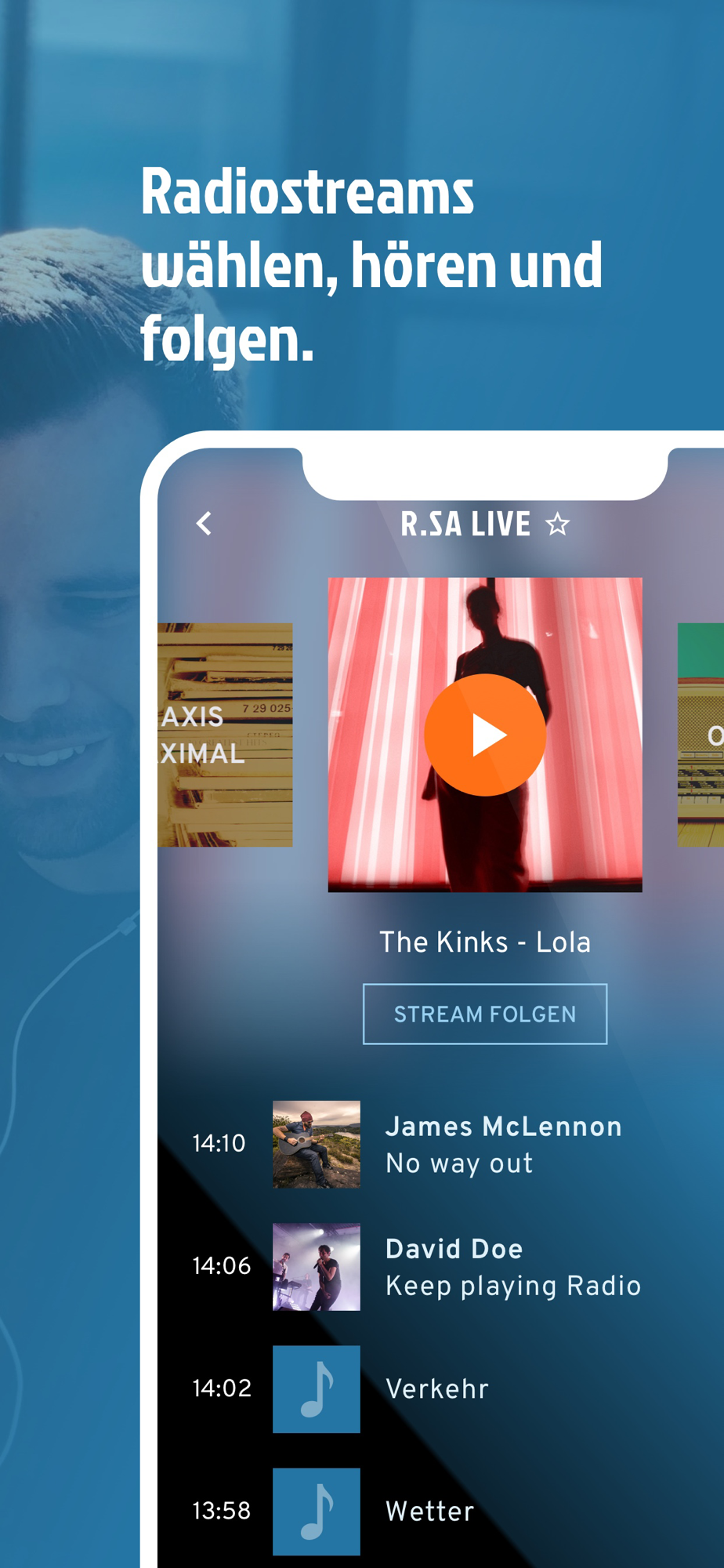 Du kannst in der R.SA-App jetzt deinen Lieblings-Channels folgen. Wann immer du die App wieder öffnest, siehst du direkt auf der Startseite deine favorisierten Radios. Dazu findest du in jedem Kanal das gerade gelaufene Programm als Zeitleiste wieder. Sinnvoll ergänzt durch gesendete Nachrichten, Wetter und Verkehr.