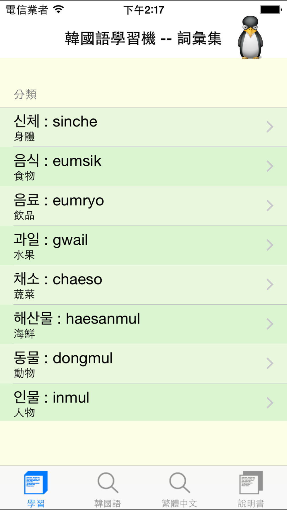 -- 提供 1,400 個韓國語詞彙,分成以下各分類,你可以隨時隨地任何時間地學習,十分方便:(1) 身體, (2) 食物, (3) 飲品, (4) 水果, (5) 蔬菜, (6) 海鮮, (7) 動物, (8) 人物 (9) 關係, (10) 感覺, (11) 家居, (12) 配件