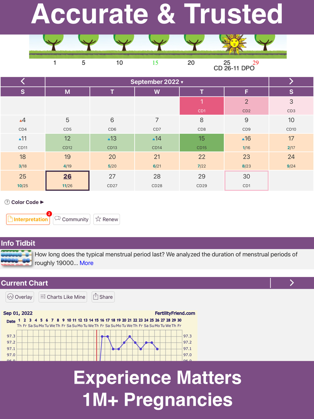 You can get pregnant only a few days each cycle. Fertility Friend accurately determines these crucial fertile days based on a few easy body observations. This app is an advanced ovulation calculator, menstrual calendar, fertility chart and period tracker. It works to help you get pregnant because it interprets your own personal fertility signs. Fertility Friend creates an exclusive fertility chart and ovulation calendar with personalized trying to conceive tips and analysis.