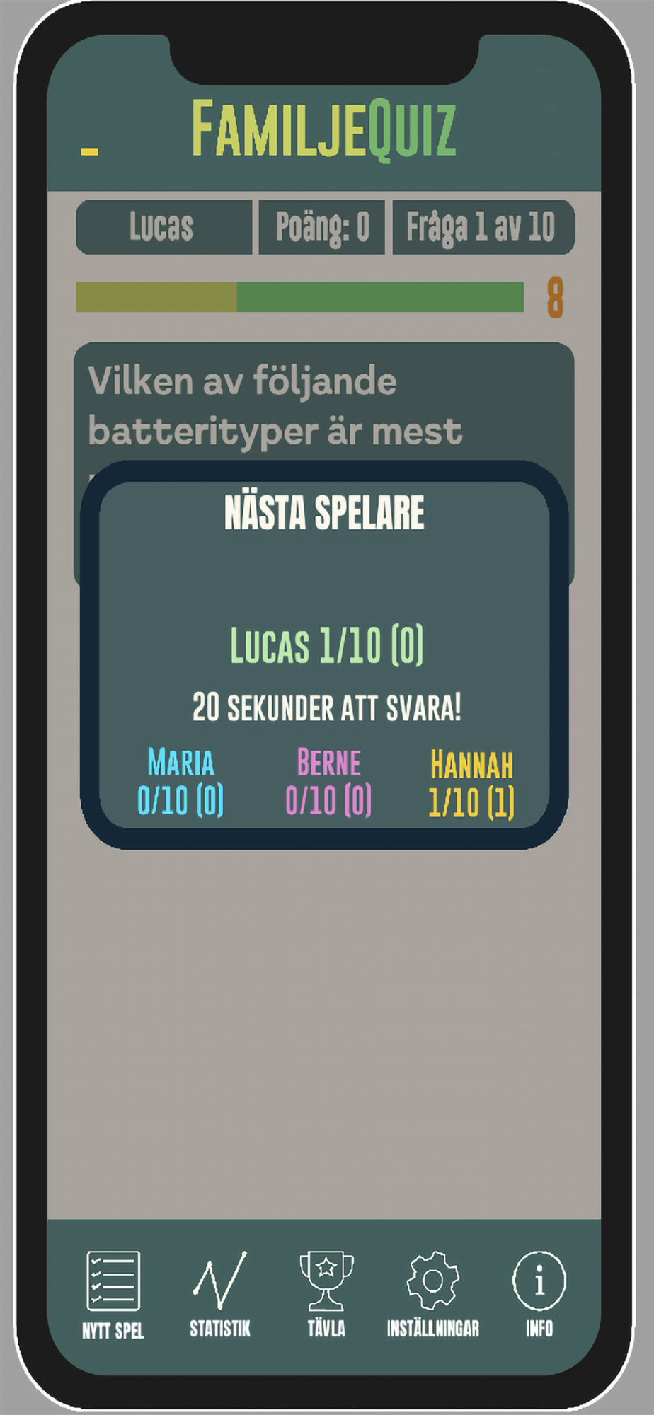 Med FamiljeQuiz får du över 5 900 frågor i olika svårighetsgrader med möjlighet att spela upp till fyra spelare. Väld om du vill ha upp till tre eller fyra svarsalternativ med eller utan tidsgräns för att svara.