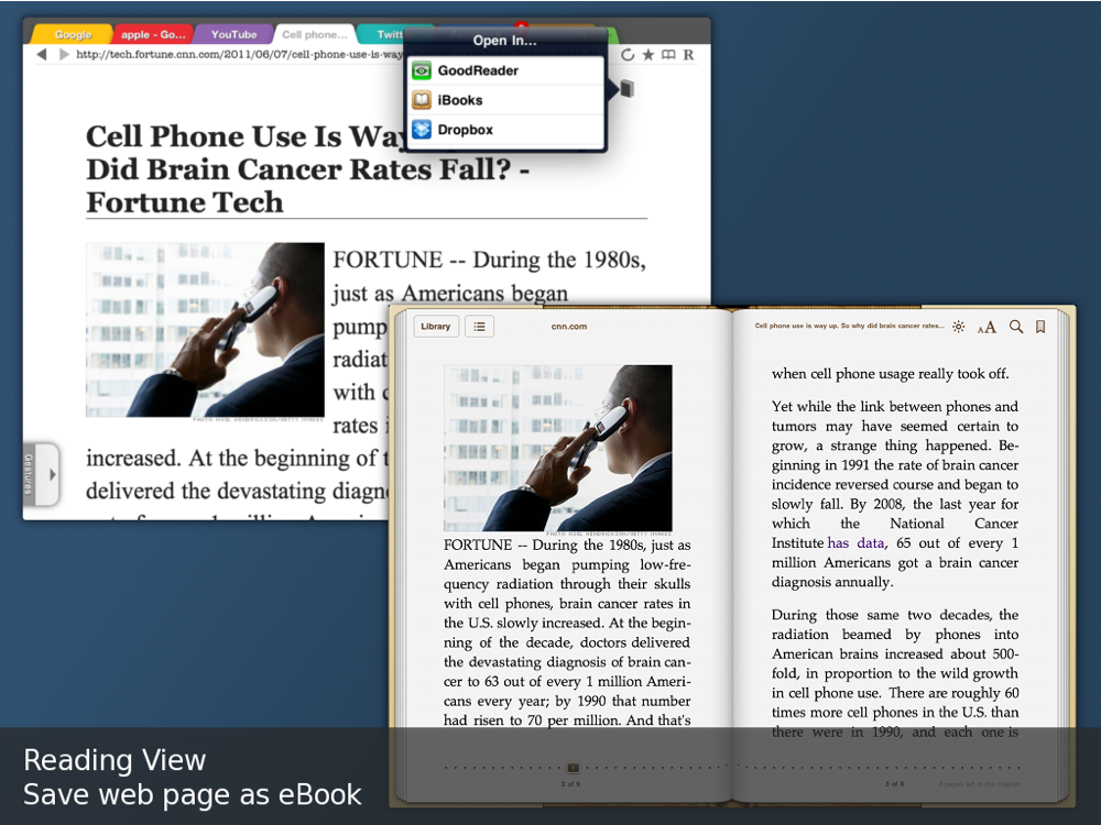 CloudSurfer is the only browser can save webpages as ebooks and view them in iBooks or other ebook readers. Reading web pages, news site, is just as comfortable as reading ebooks on your iPad. All the saved ebooks can be read anytime with your favourite eBook reader, online or offline and the images of the page are included too.