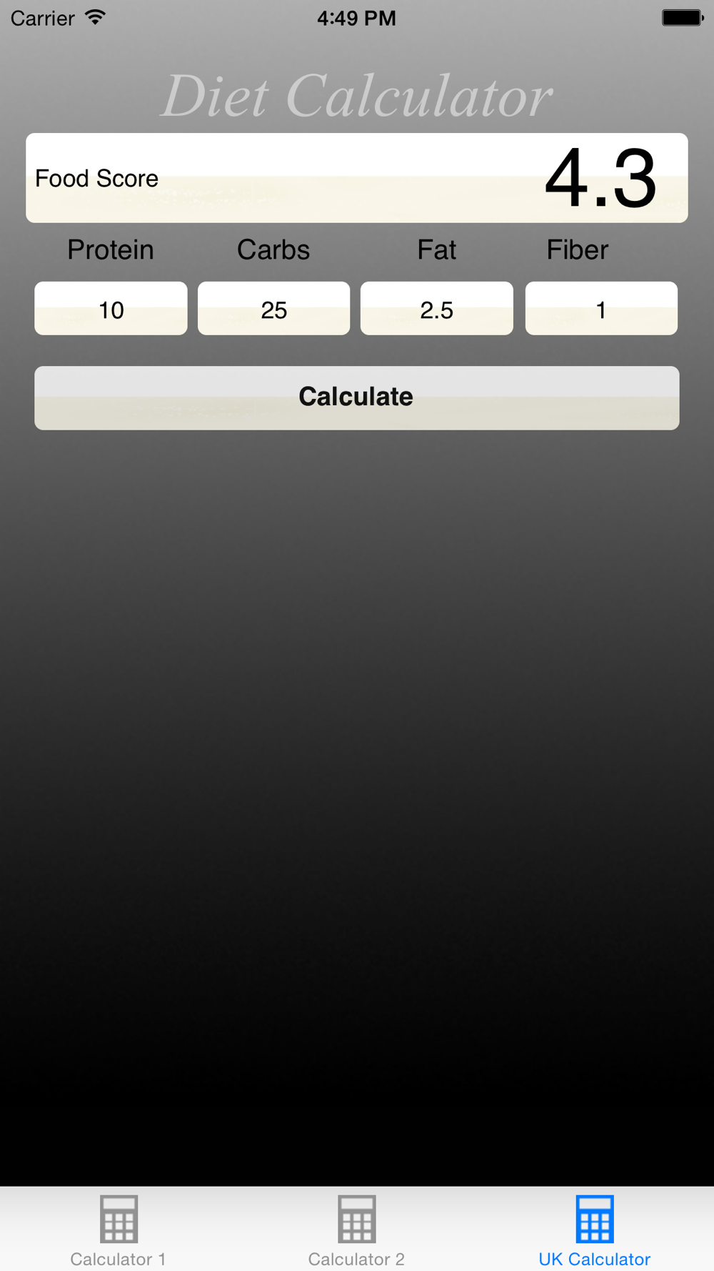 DietCalculator makes balancing your daily food intake a breeze. You simply enter the nutrient values, even fractional ones, of any food that has a nutrition label, and DietCalculator will give you the balanced value in a small number. Such calculations can help, too, with weight loss by simplifying the work of balancing nutrient intake in your diet. With DietCalculator, you can choose between two ways of making such calculations. You can calculate the balance of calories, fat and fiber or of protein, carbohydrates, fat and fiber. Both ways are now available in this single easy-to-use app!!