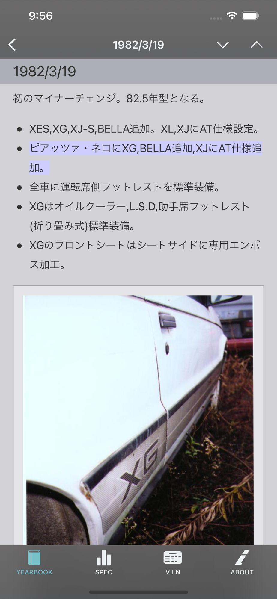 PIAZZA Database consists of 3 applications. Yearbook (chronological table), Specification of 6 different models, and VIN plate decorder application.
