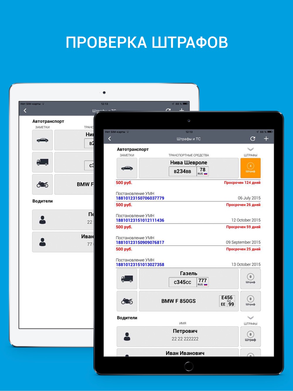 - ШТРАФЫ (Проверка по водительскому удостоверению и номеру свидетельства о регистрации ТС и оплата) – доступно при обновлении