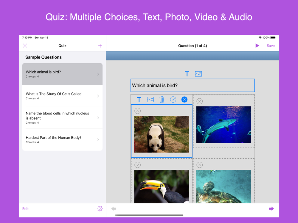 * Insert title, paragraph, images, videos, links, gallery, list, HTML, table, audio recording, music, question, equation(LaTeX), embed html, iframe and map