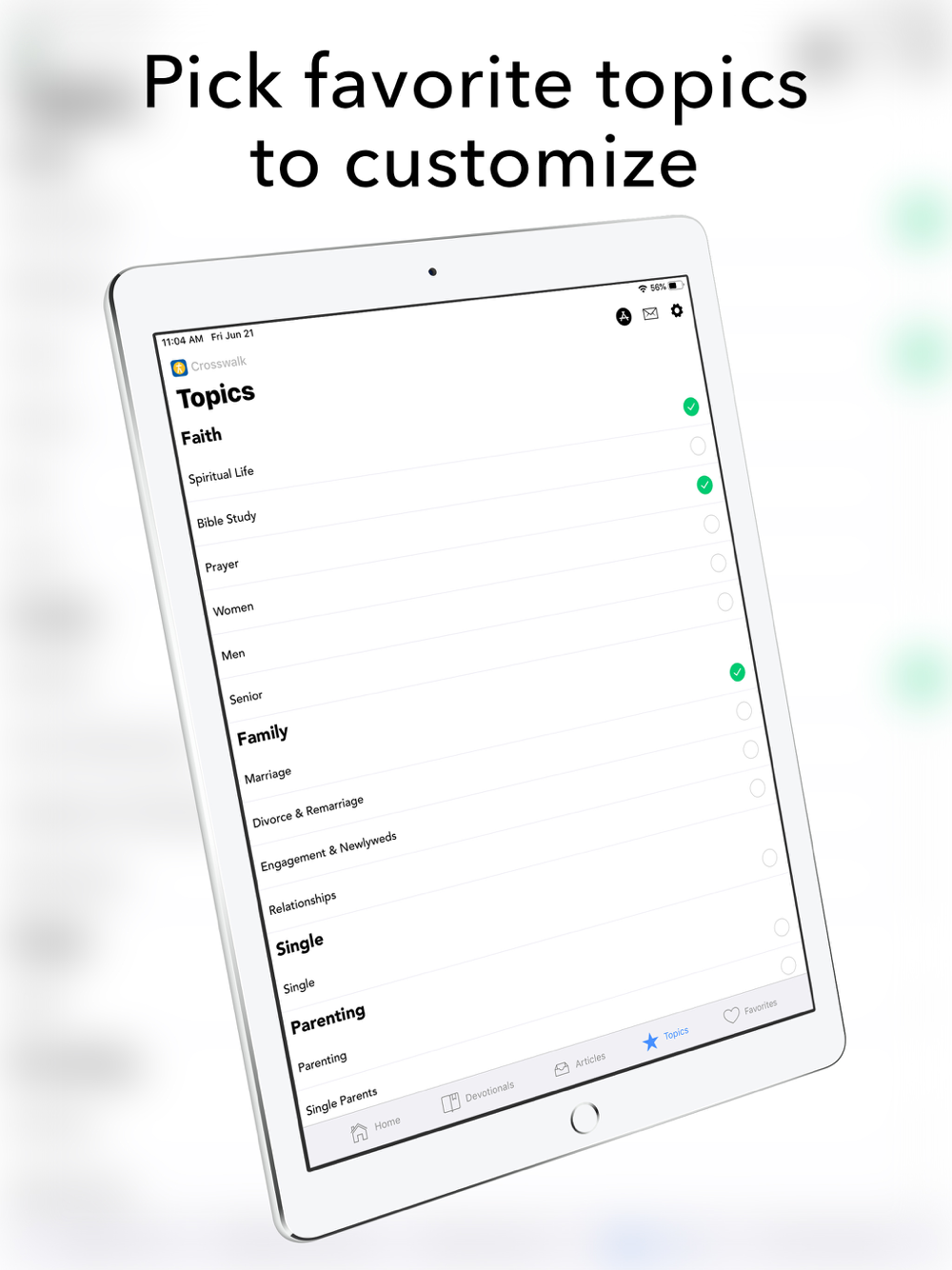 The Crosswalk.com app allows YOU to customize the content you consume! It's quick and easy to set your home screen with the topics you want to read about and to mark as favorites the articles you want to save and read again later.