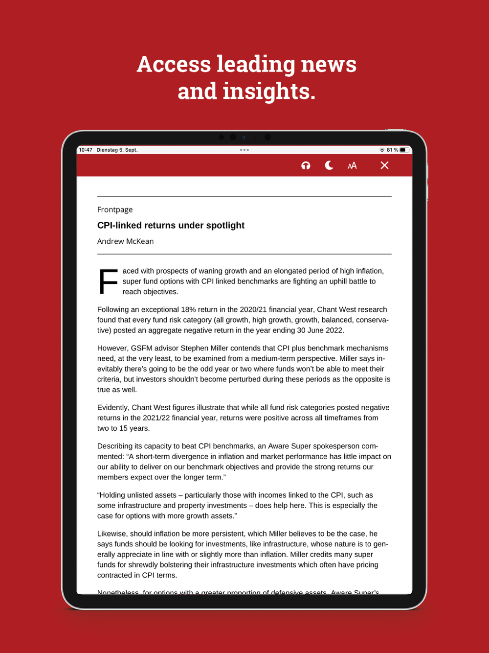 Financial planning, superannuation, investment professionals will benefit from the in-depth news, analysis, special reports and performance updates available in the app.