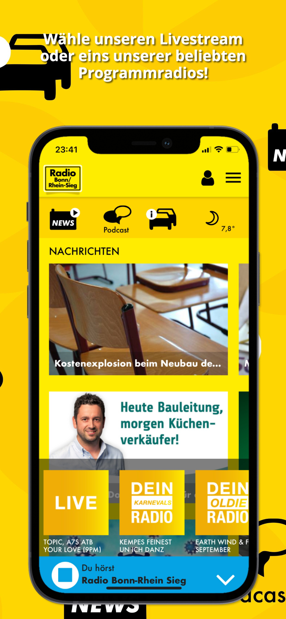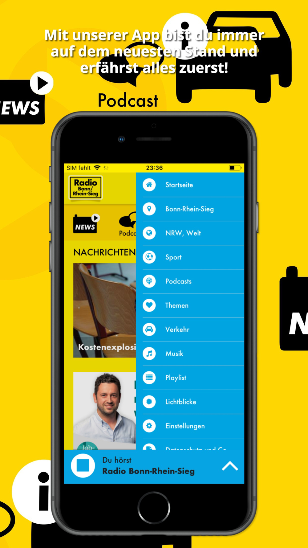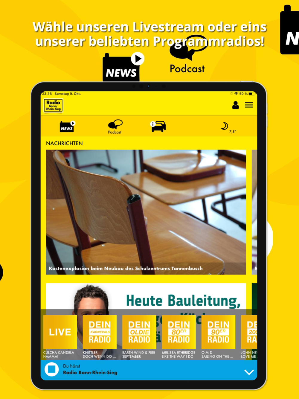 Mit unserer App bleibt ihr immer auf dem neuesten Stand. Wir bringen alle Infos aus Bonn und dem Rhein-Sieg Kreis auf euer Smartphone. Aktuelle Nachrichten, Infos zum Programm, Events und Aktionen. Hört das Programm über unseren Livestream oder wählt einen unserer Channel aus. Außerdem bekommt ihr die wichtigsten Infos direkt als Push-Mitteilung auf eurem iPhone oder auf der Apple Watch.
