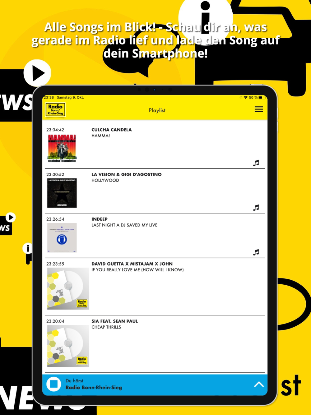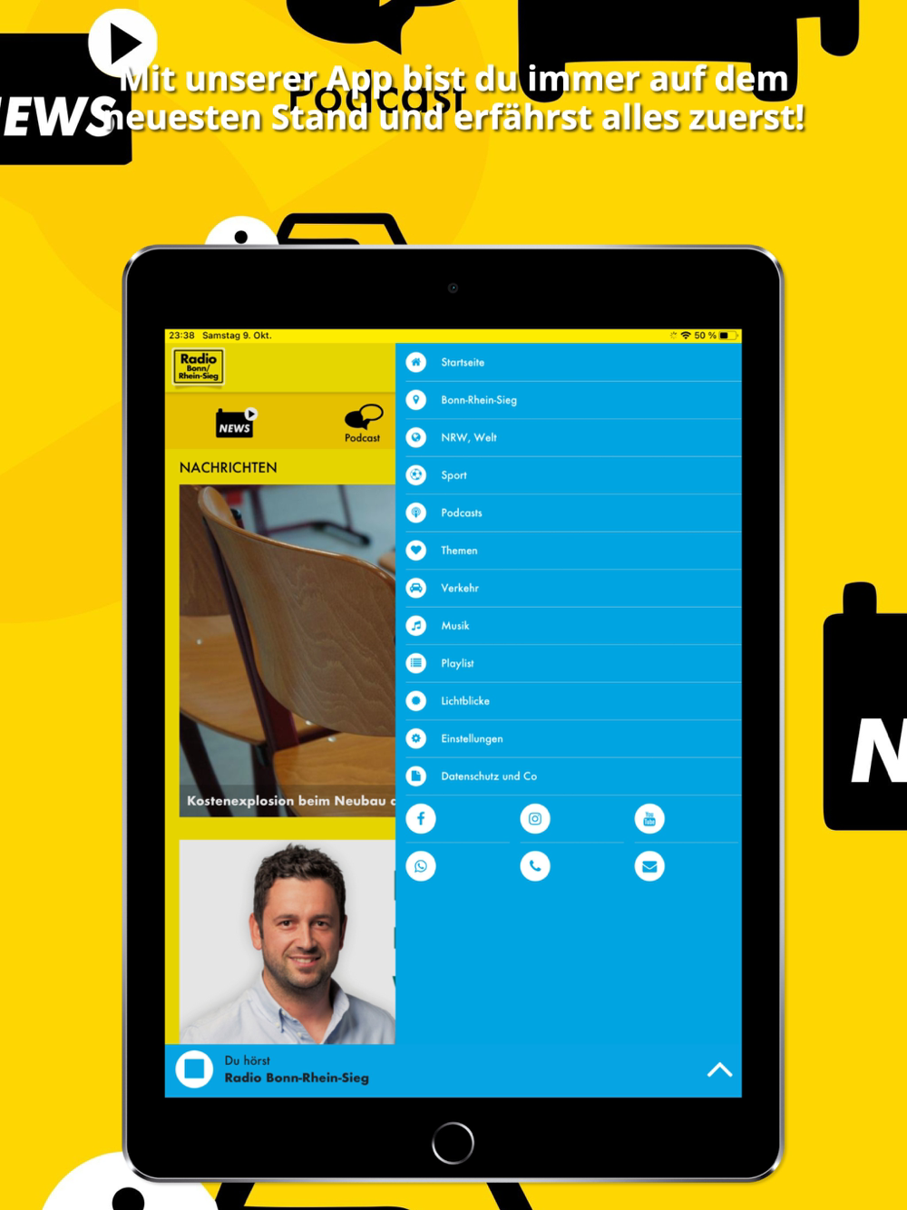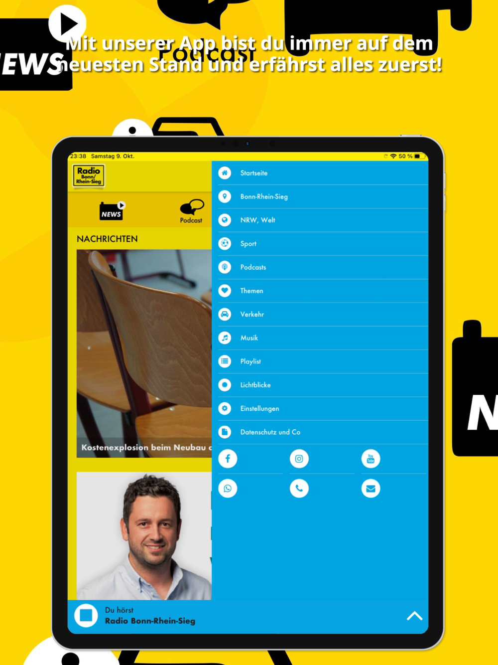 Mit unserer App bleibt ihr immer auf dem neuesten Stand. Wir bringen alle Infos aus Bonn und dem Rhein-Sieg Kreis auf euer Smartphone. Aktuelle Nachrichten, Infos zum Programm, Events und Aktionen. Hört das Programm über unseren Livestream oder wählt einen unserer Channel aus. Außerdem bekommt ihr die wichtigsten Infos direkt als Push-Mitteilung auf eurem iPhone oder auf der Apple Watch.