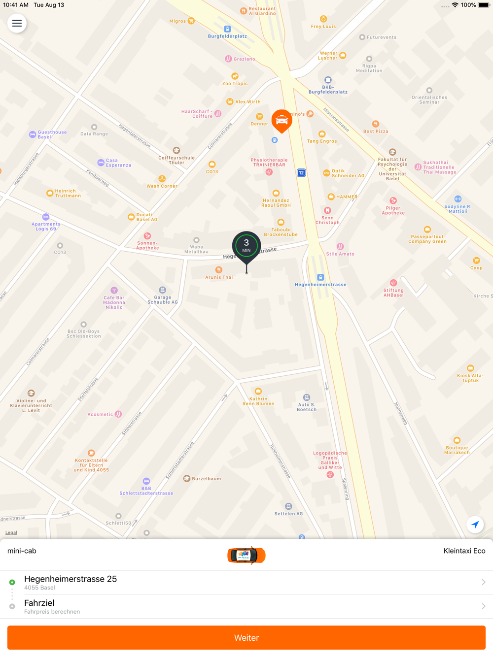 Über 60‘000 Taxis verfügbar: Bestellen Sie Ihr Taxi in Basel und 100 anderen Städten Europas mit zwei Klicks zu Ihrem Standort. Geben Sie Ihre Sonderwünsche bekannt und bestätigen Sie Ihre Bestellung. Die Anfahrt Ihres Taxis wird angezeigt. Auch Vorbestellungen sind möglich.
