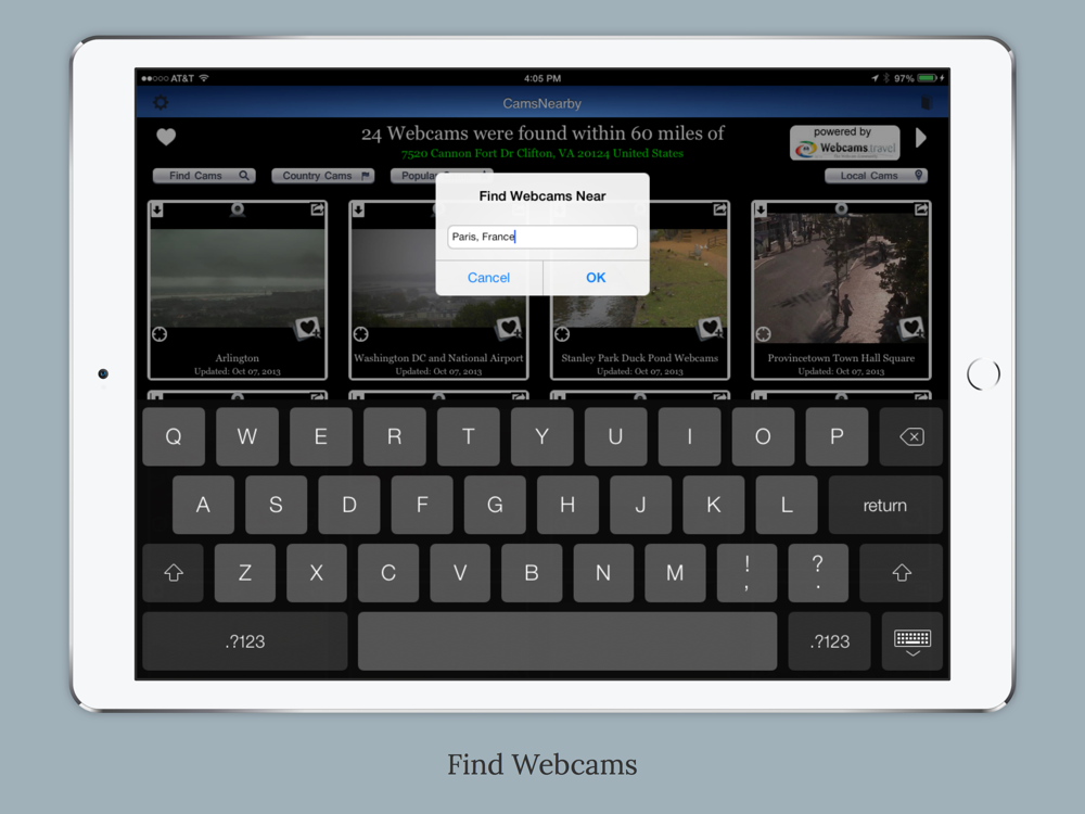 To search for webcams near a specific address, click on the Find Cams button. If results are found, webcams near that address will then be displayed. To revert to the webcams for your current address at any time click the Refresh Cams button.