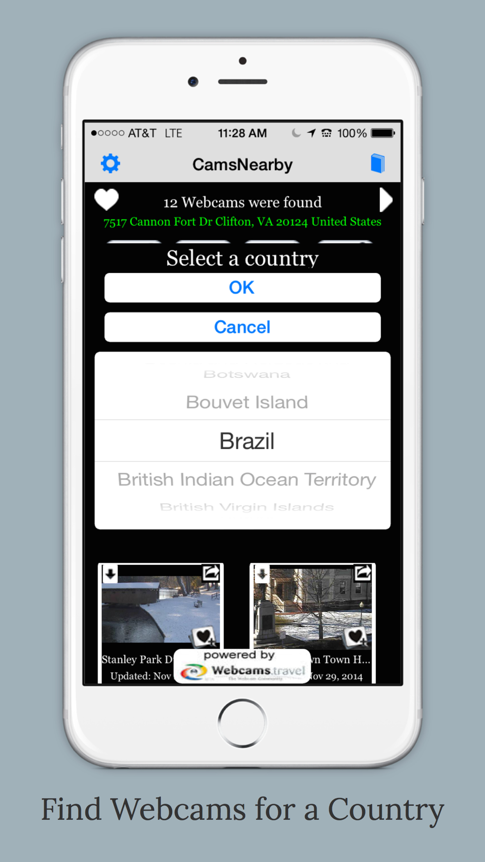 Shows live webcams near your current location. You can also search for webcams near a specific address, a specific country, popular webcams around the world and manage your favorite webcams.