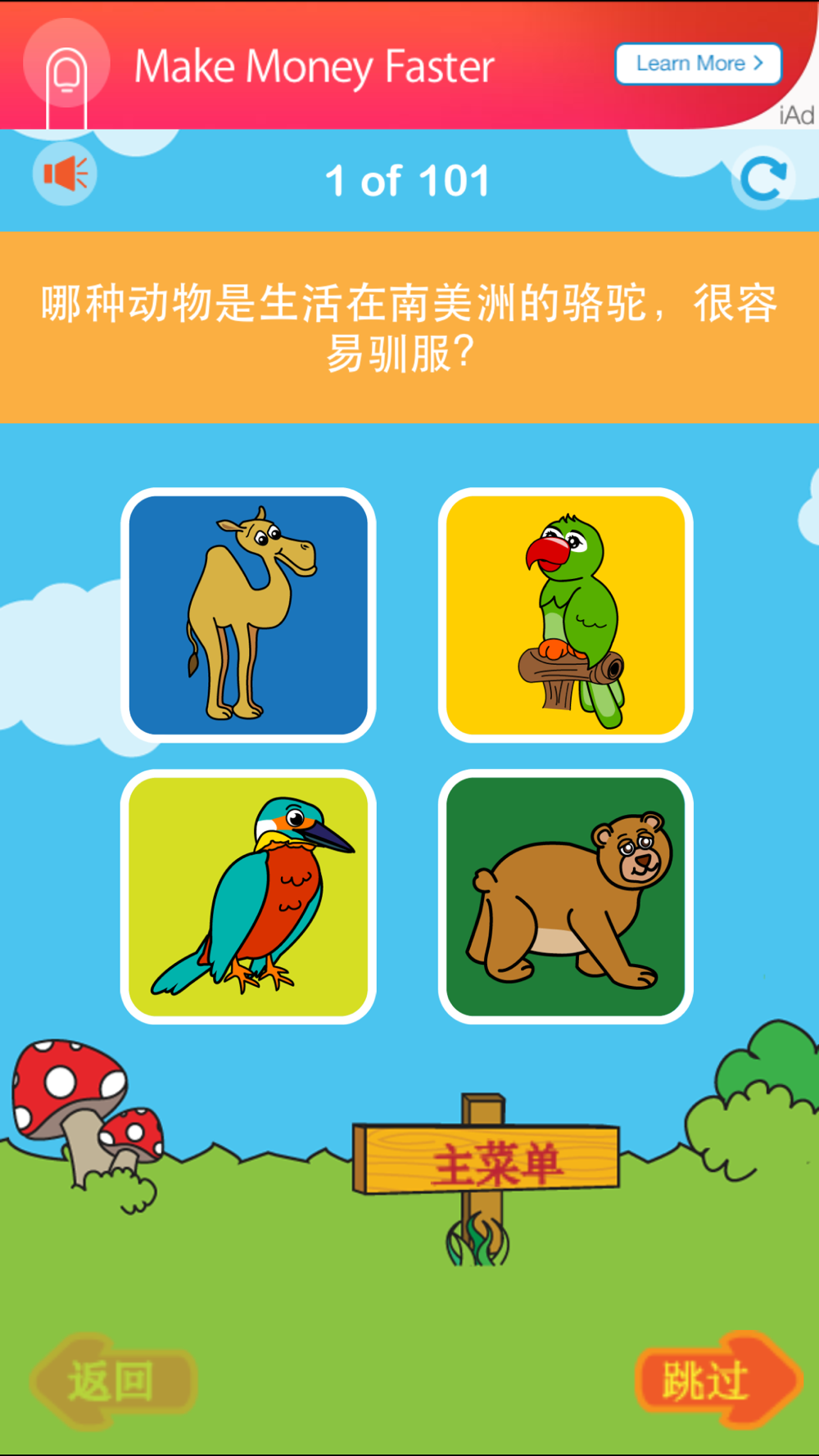 “动物101” 产品的问世来自于我们的个人经历,是我们从教自己的孩子认识动物的过程中得到的启发。所有的孩子都热爱动物,但他们更热爱的是玩“猜这是什么动物”的游戏。“动物101”是最终研发的移动学习软件,它为儿童学习动物提供了一种生动活泼的方式。这种声音驱动的移动游戏甚至可以让还无法阅读的孩子享受游戏的乐趣。视觉生动的图片给孩子们创造出一种娱乐的氛围,孩子们可以选择玩游戏或仅浏览各种各样的动物。我们希望孩子们会喜欢这款游戏软件,同时也从中获取知识。