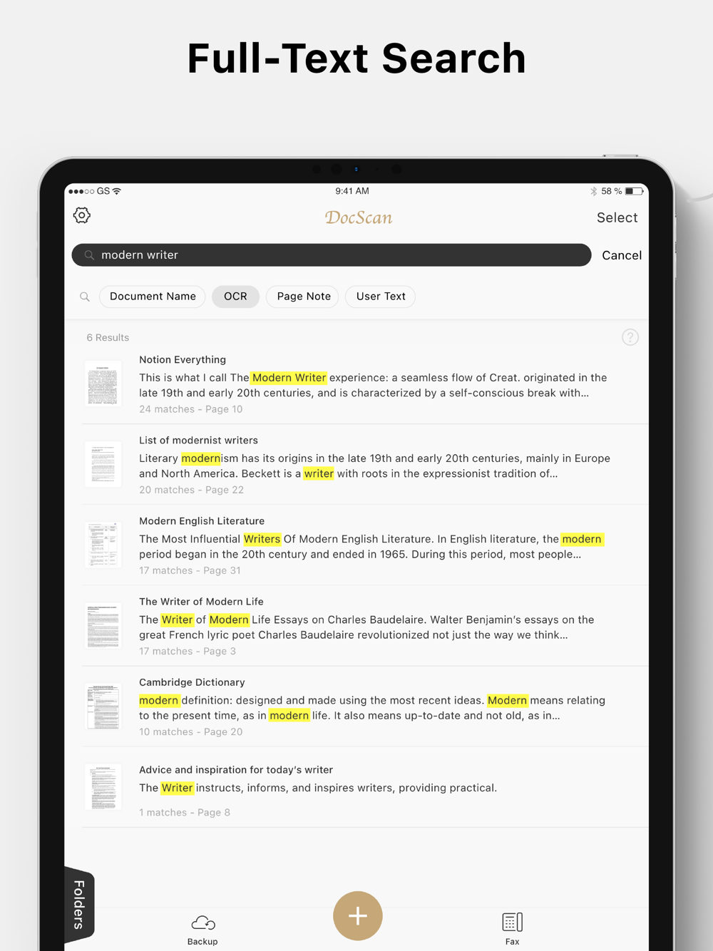- Search documents by name, full text search on OCR texts, page notes, and user input texts