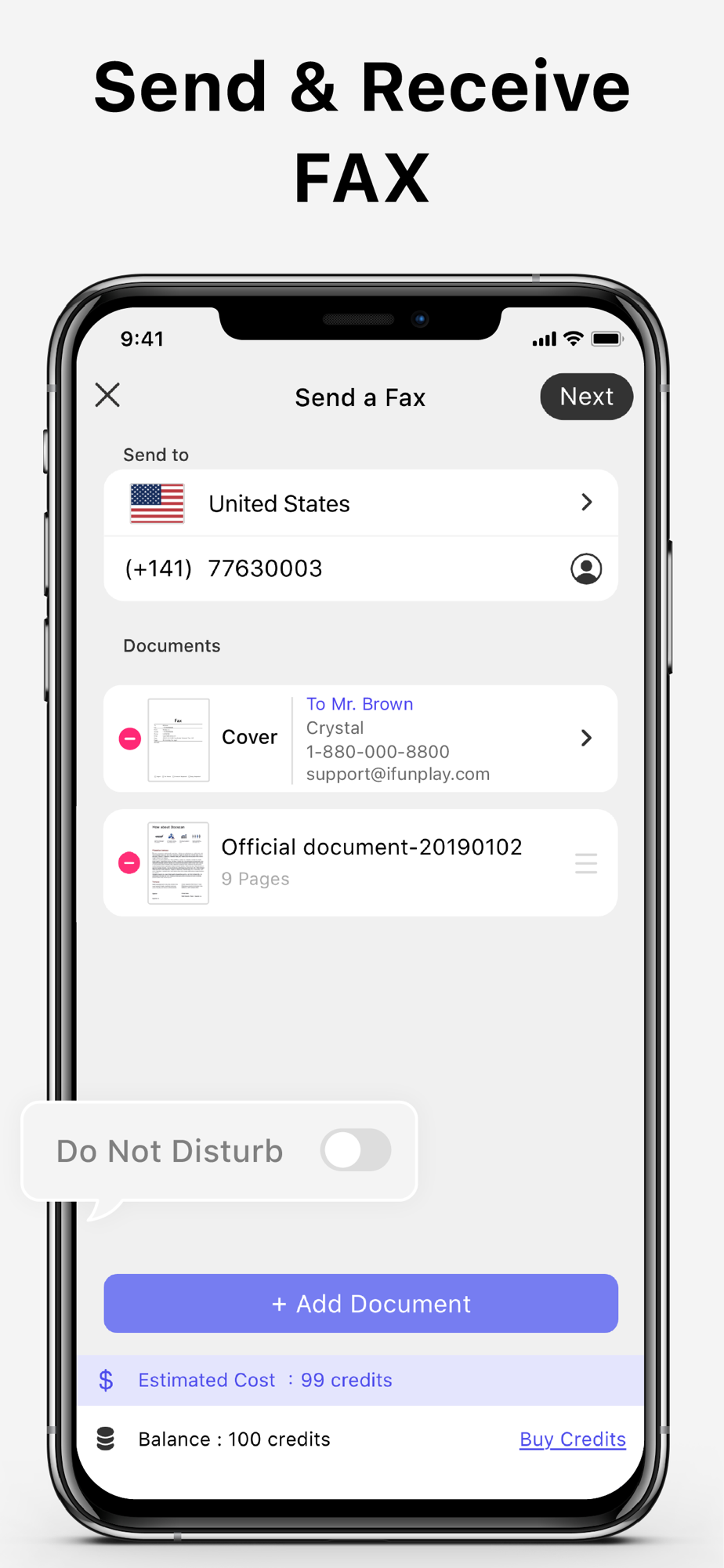- In-App Fax: Send and receive faxes when you are out of the office or have no fax machine at all. Fax over 100 countries (cost calculated by the number of pages and recipient country and paid via in-app purchase). Receive a push notification to remind you of a fax status change: sent or received successfully or failed to deliver