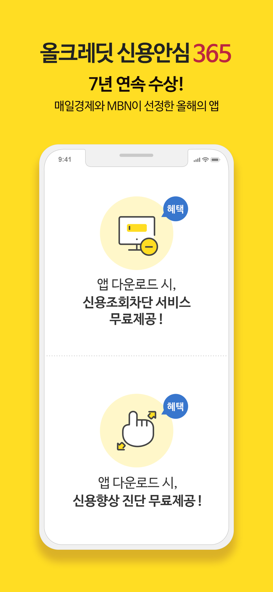 - 올해의 앱 7년 연속 선정: 매일경제 신문과 MBN이 선정한 올해의 앱 신용평가 부문 1위!!
