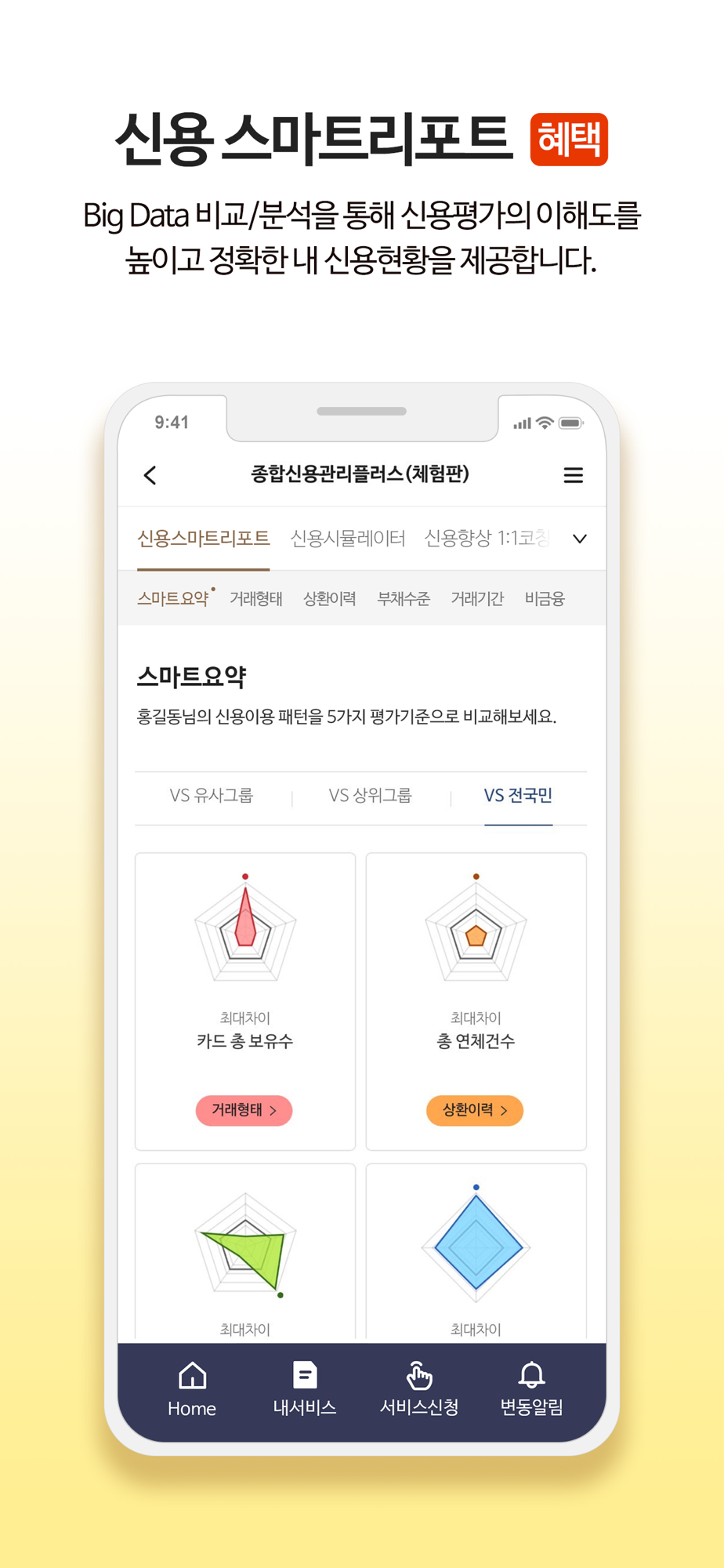 4. 스마트리포트 : Big Data 분석을 통해 전국민 대비 내 신용상태를 파악하여 상대적 위험 수준 판단