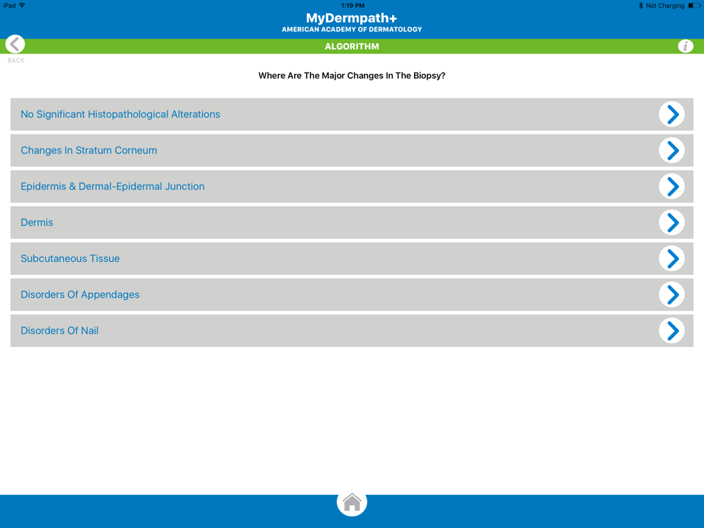 MyDermPath+ features interactive algorithms for generating differential diagnosis using a clinicopathological approach and includes the ability to move forward and backward within algorithms. This approach to diagnosis with clinicopathological correlation has the potential to improve diagnostic accuracy and creates an excellent learning environment.