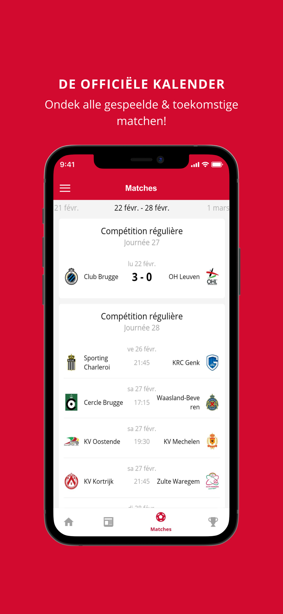 - Toegang tot de details van alle komende wedstrijden