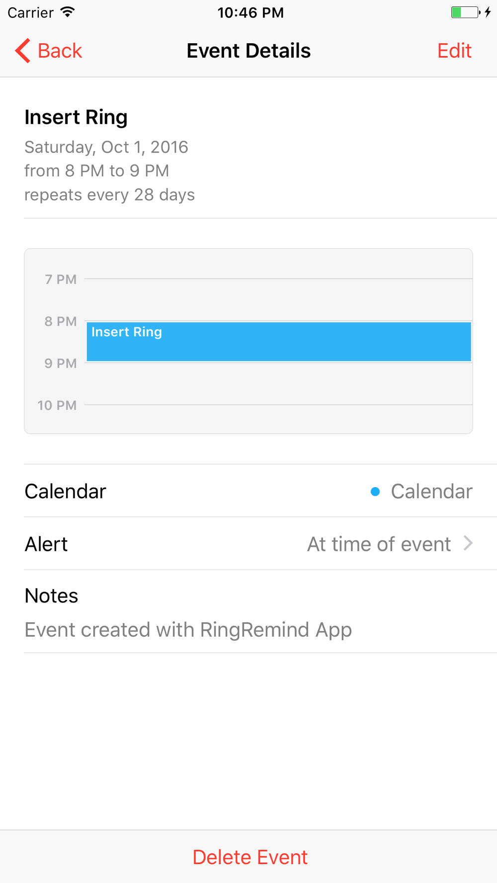 RingRemind provides a simple interface to schedule "Insert Ring" and "Remove Ring" events. All you have to do is select an "Insert" date and the repeating events will be added to your calendar. If you would like to customize the events' titles and settings, it can be done using the default Calendar app.
