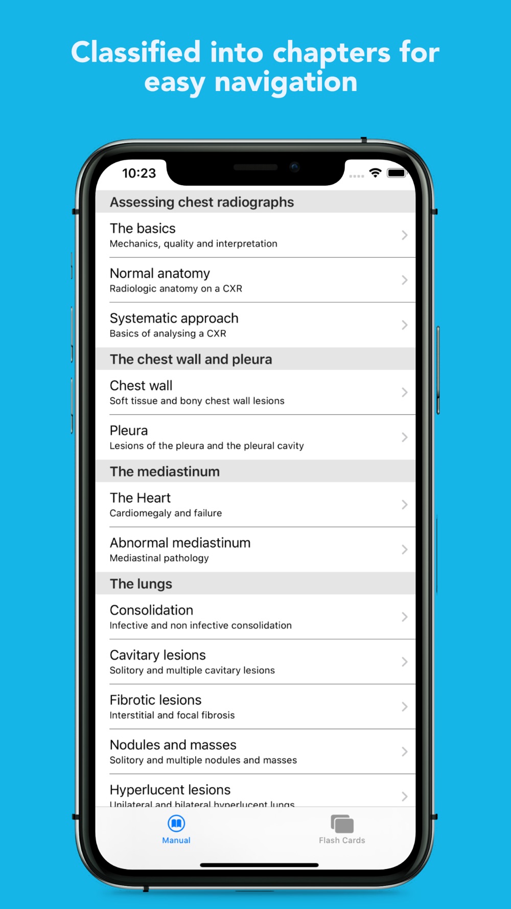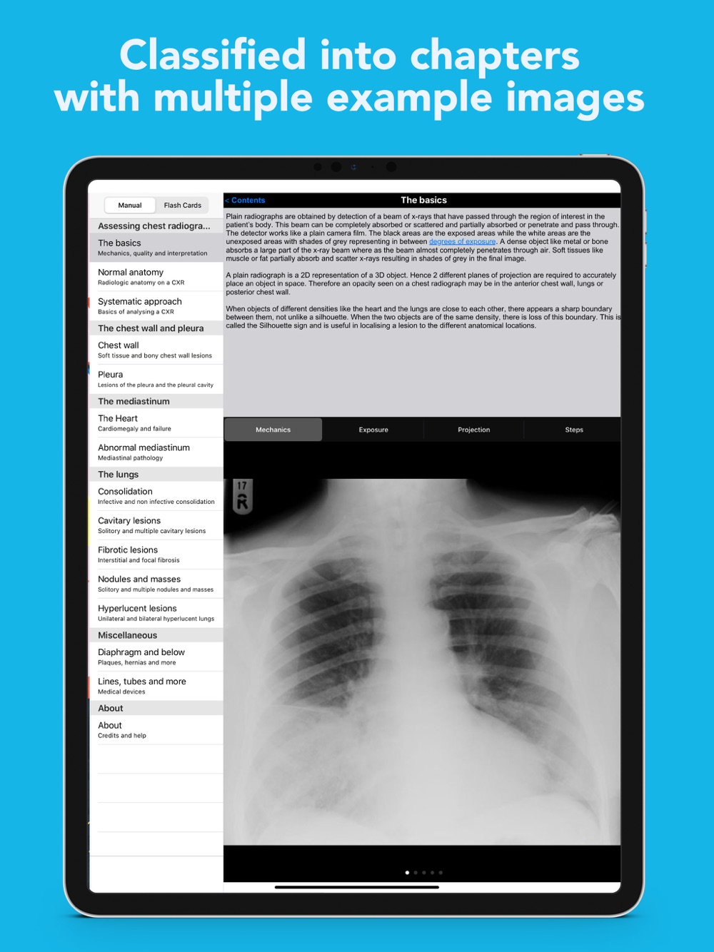 The app contains more than 200 high quality images of common and uncommon conditions and a simulated PACS work station. A detailed manual with 14 chapters is an ideal companion if you are a medical student, radiology resident, radiographer, a medic on the ward or preparing for board exams. It teaches the beginner (and perhaps not so much of a beginner) the technique of interpreting a chest radiograph. Over 70 flash cards on specific conditions provide short and succinct information, ideal when that odd looking film shows up on the screen. Unlike a traditional book, each condition is provided with multiple example images for better understanding.