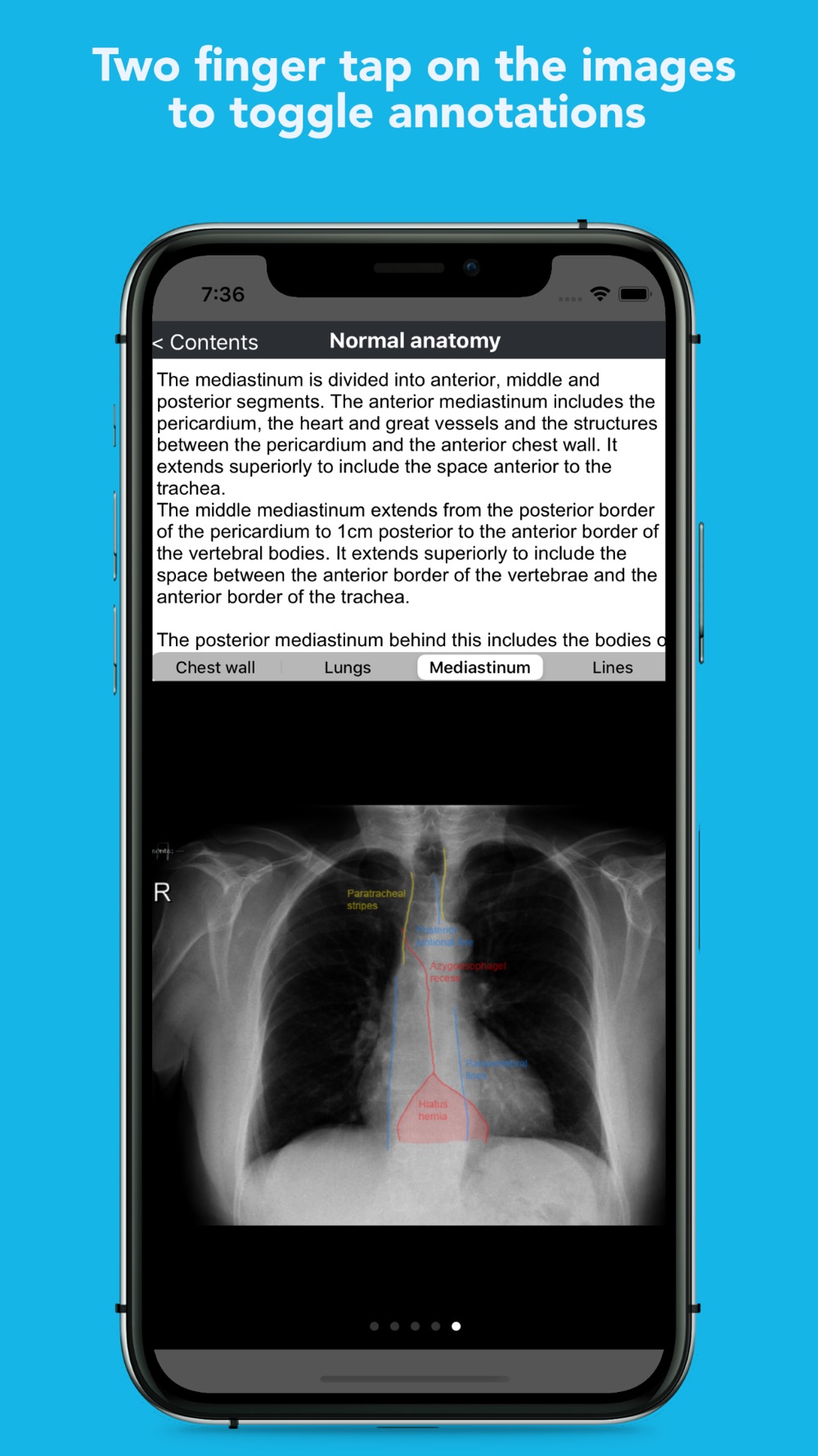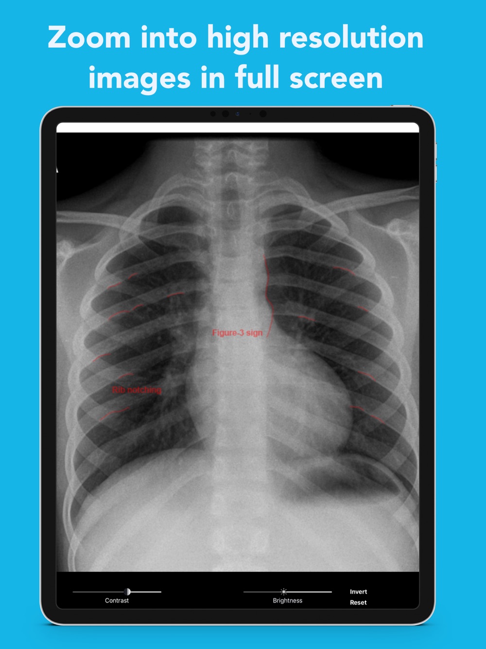 Thanks to the beautiful high resolution screen, iCXR virtually turns your device to a mini PACS work station. Zoom the image by using familiar pinch gestures, use built in tools to change contrast and brightness and invert the image for a near real life experience. Over 100 detailed pictorial and text annotations superimposed on the images help better understanding. You can turn off the annotations to appreciate the findings better.