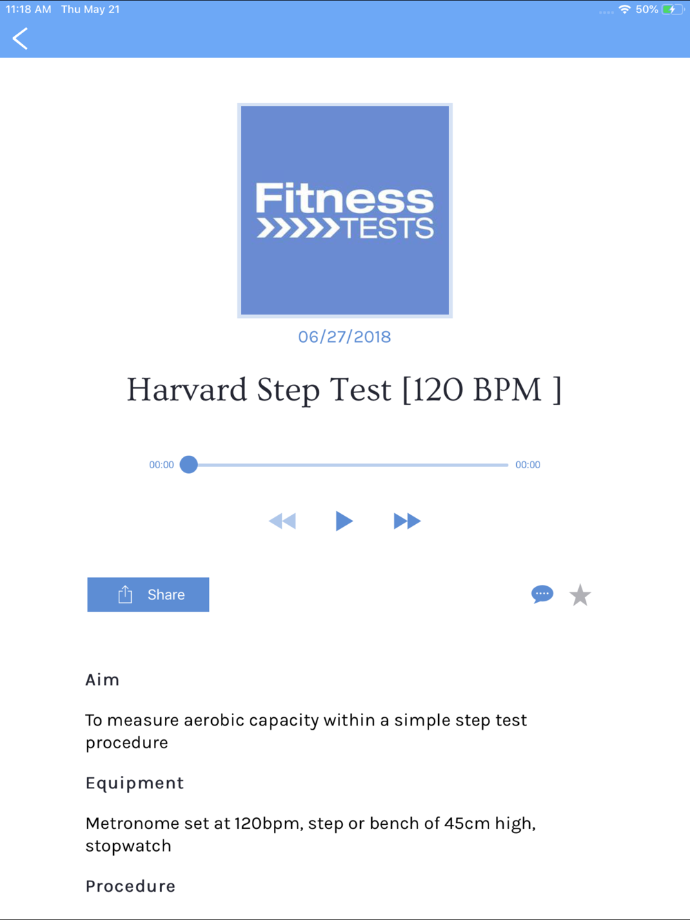 The app allows for swift reference of over 30 fitness tests from aerobic capacity, through to flexibility. Upon selecting your test you will be provided with the aim, equipment, procedure and the norm standards so that you can easily and accurately complete the tests you desire.