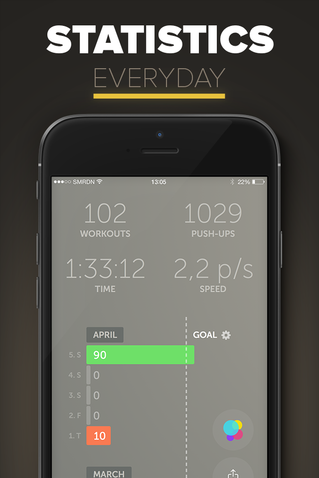 Further more, it will remind you about the time to push-up in accordance with your training schedule, shows the plan of your trainings and let you share your achievement to your friends in Facebook and Twitter.