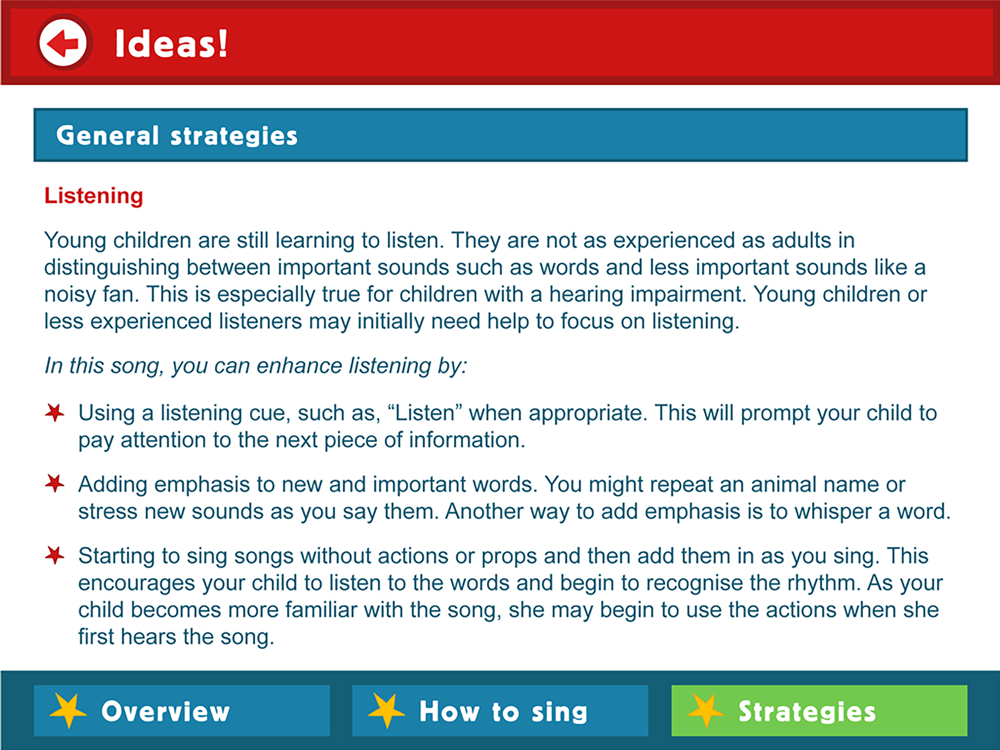 This section provides strategies and techniques, including instructional videos on how to use Old MacDonald to develop listening and language skills. This is achieved through interactive play, craft, and ideas on how to sing the song differently. These ideas are grouped together depending on your child’s language level: