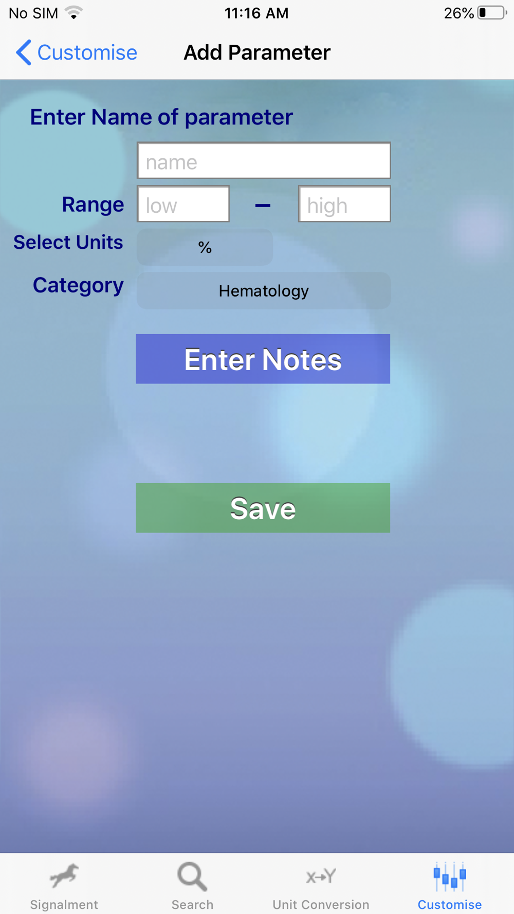 The App comes with an onboard conversion calculator, allowing you to convert data given to you in unfamiliar units back into the units you use yourself. The App can be fully customized to allow you to adjust ranges to the normal values for your own lab, change units and add data.