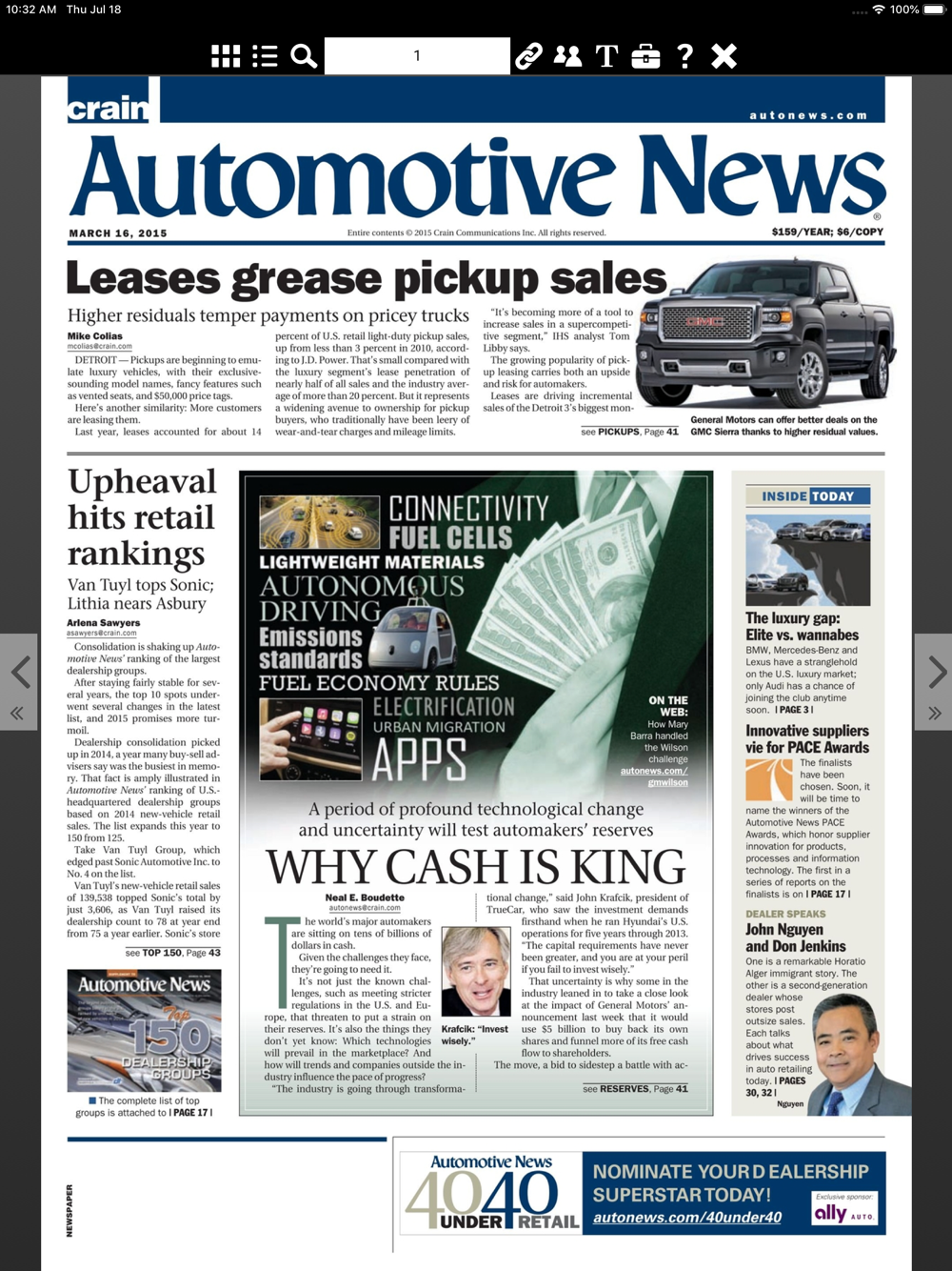 Read our weekly issue on your iPad each Monday morning. Automotive News is the leading source of news about the North American automotive industry, and offers both print and digital only subscriptions.