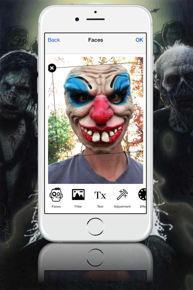 Transform yourself into a zombie, vampire, clown and more in seconds with Mask Booth. Grab an image from your library and start your transformation - more than one person in your image? No problem - you can transform everyone, no matter how many are there. Check out the screen shots - your transformation will only take seconds.