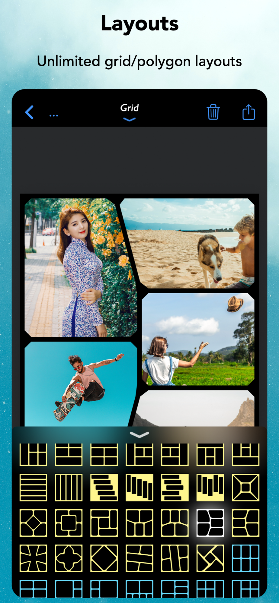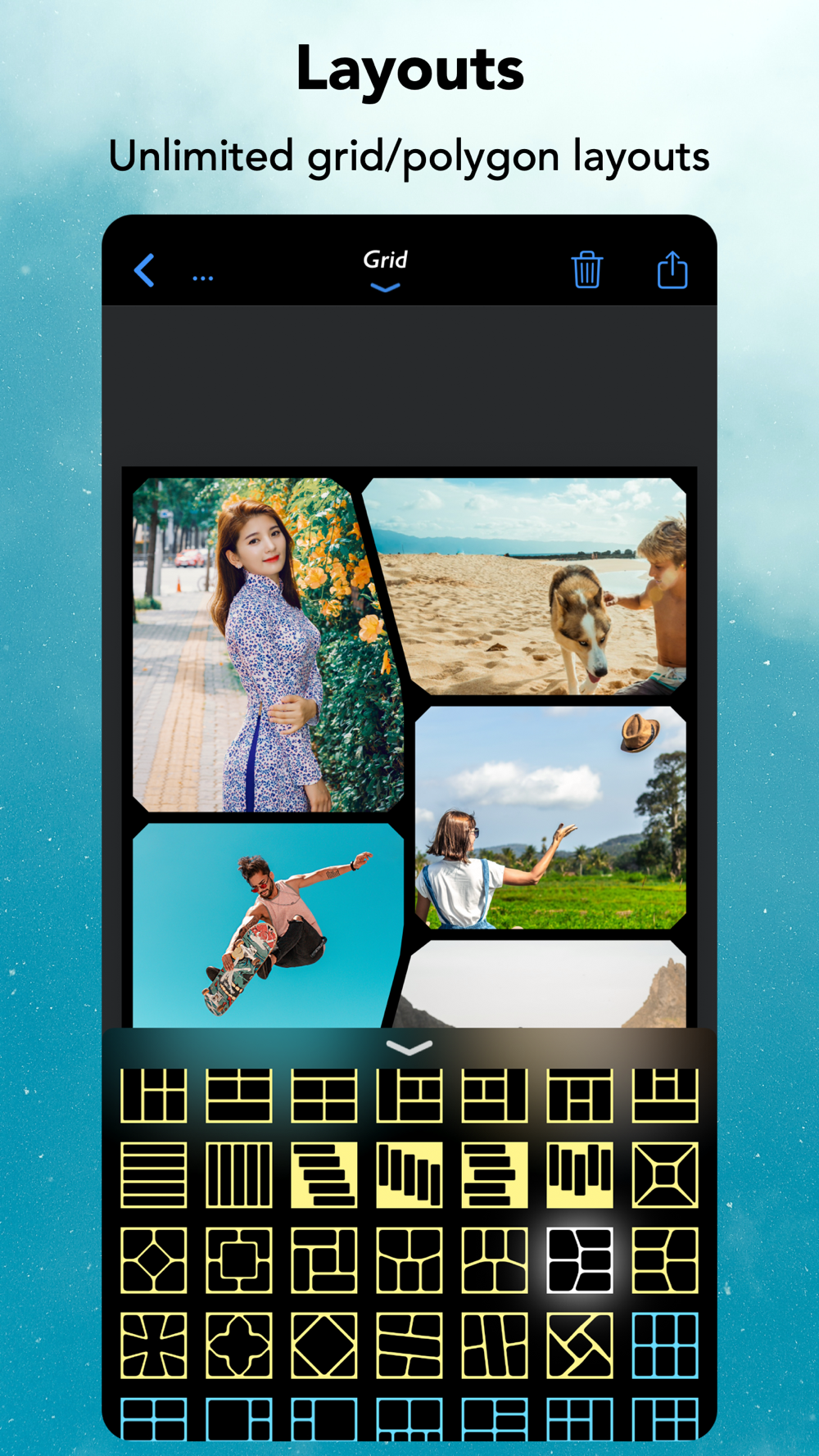 - Grid : Combine mulitple photos with hundreds of rectangular and polygonal layouts.