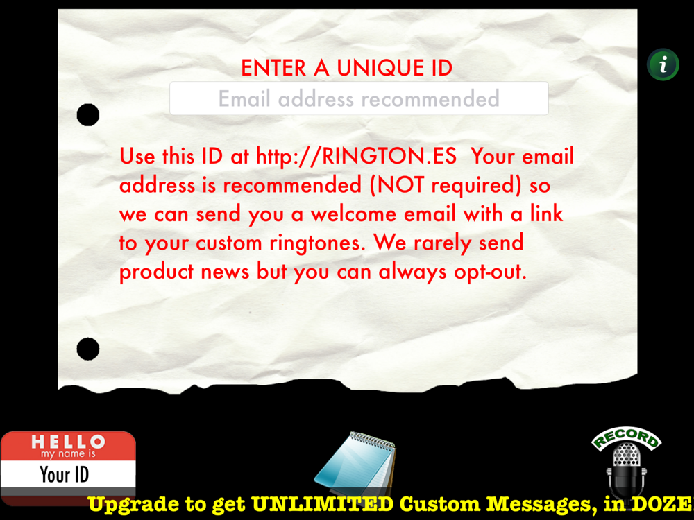 Create UNLIMITED custom ringtones using the app! Then, ON YOUR MAC OR PC, visit http://RINGTON.ES/_abc_ where _abc_ is whatever ID you entered when you first ran the app. We recommend using your Email address but you do not have to. Just enter something UNIQUE with NO SPECIAL CHARACTERS (i.e. $#*+ etc.) This way, you can share your ringtones with your friends. In fact, create a ringtone for THEIR phone to play when YOU call THEM! Ringtones are created in BOTH the iPhone's .m4r format as well as .MP3 which other phones may use!