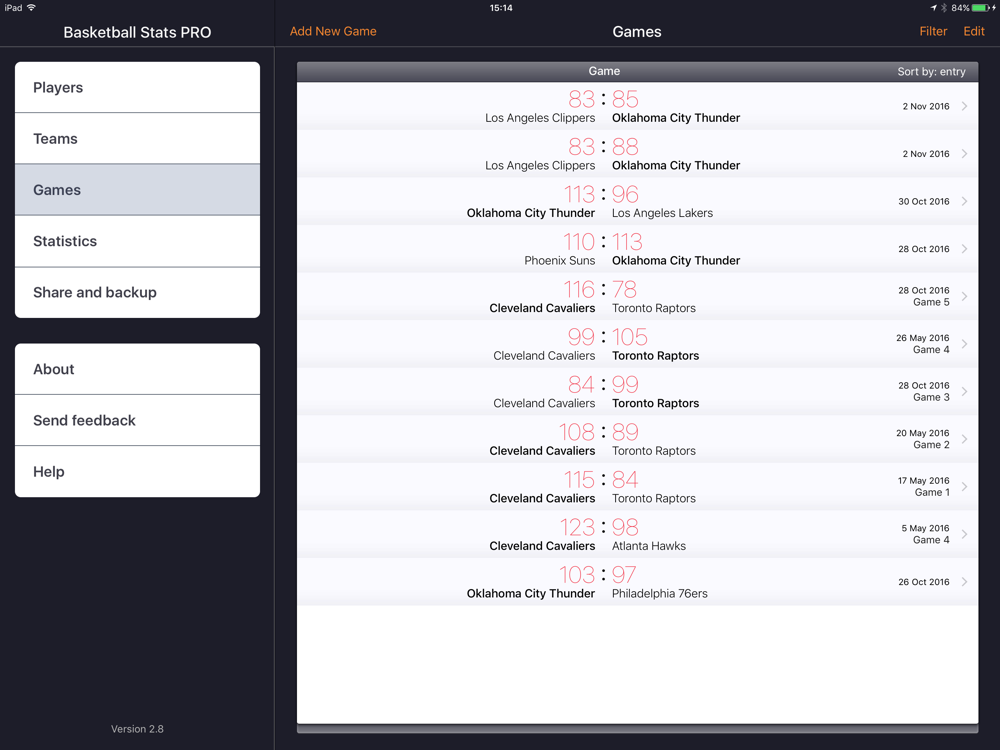 All the inputted statistics are written to a local database, thus you can view stats of a given player for not just one game, but all the games where the player has been involved in. Statistics view for a player will show box scores for each game as well as compiled total and average stats. You can even see the stats of players shots based on where they were taken (inside the paint, mid-range, 3 point shots from the corner and other 3 point shots). You will soon realize that this stats app can really help you with efficient stats input and analysis after the game.