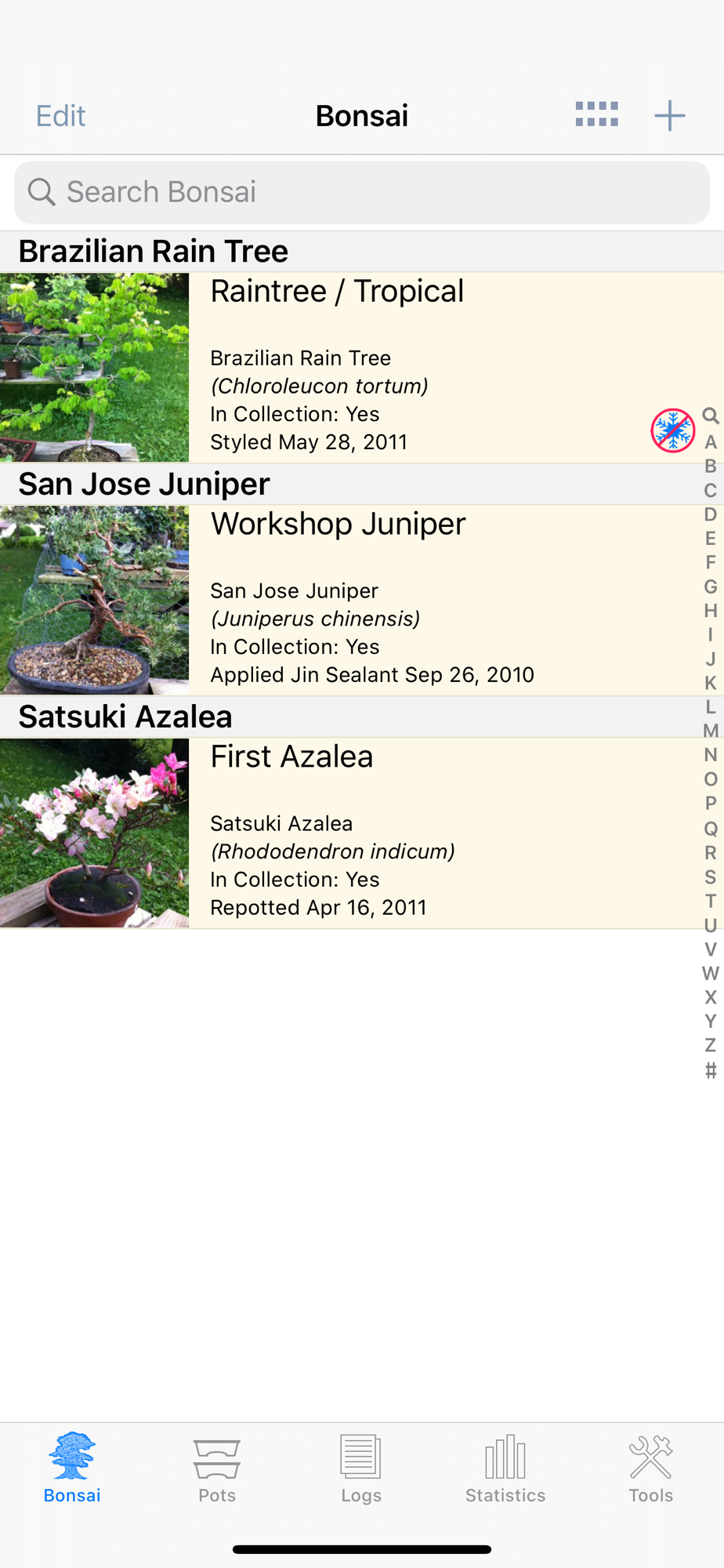 Bonsai Album makes keeping track of your Bonsai or Penjing collection easy. Track development of your trees throughout their lives, on your iPhone, iPad, or iPod touch!