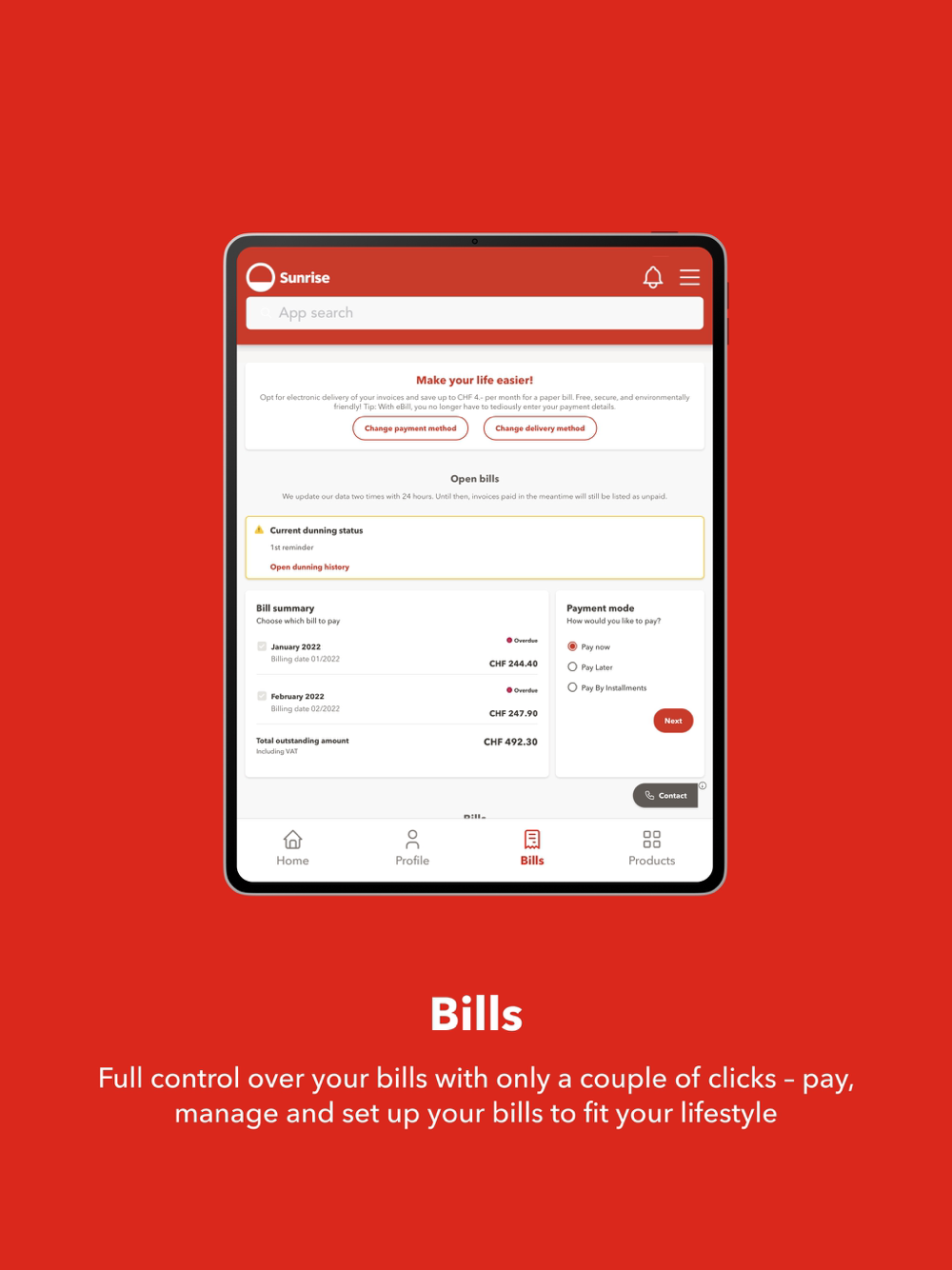 The My Sunrise app makes your life easier: All your bills, personal information, subscription and usage in one app. Always at hand when you need it.
